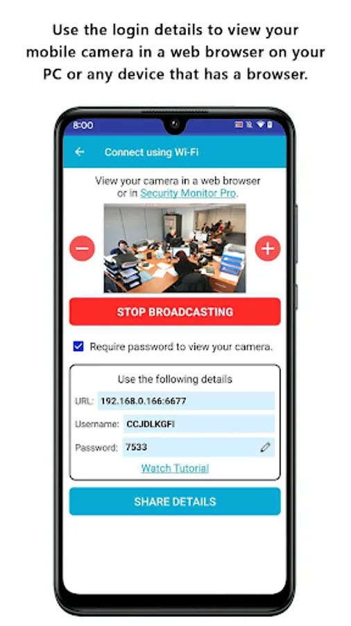 Just like any good IP camera, this application also works with video surveillance software, such as - Security Monitor Pro and IP Camera Viewer.