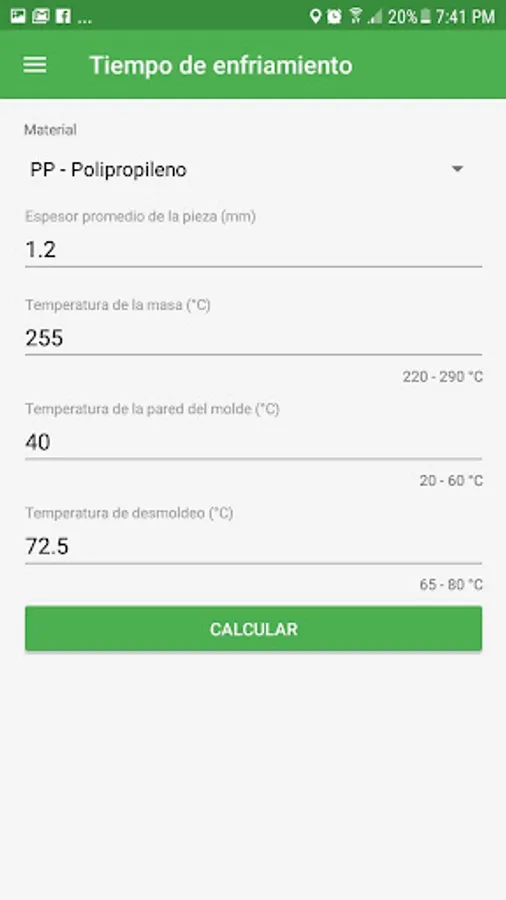The application is to calculate the initial parameters to be placed in the injection machine, injection molding, plastic injection, polymer injection such as: