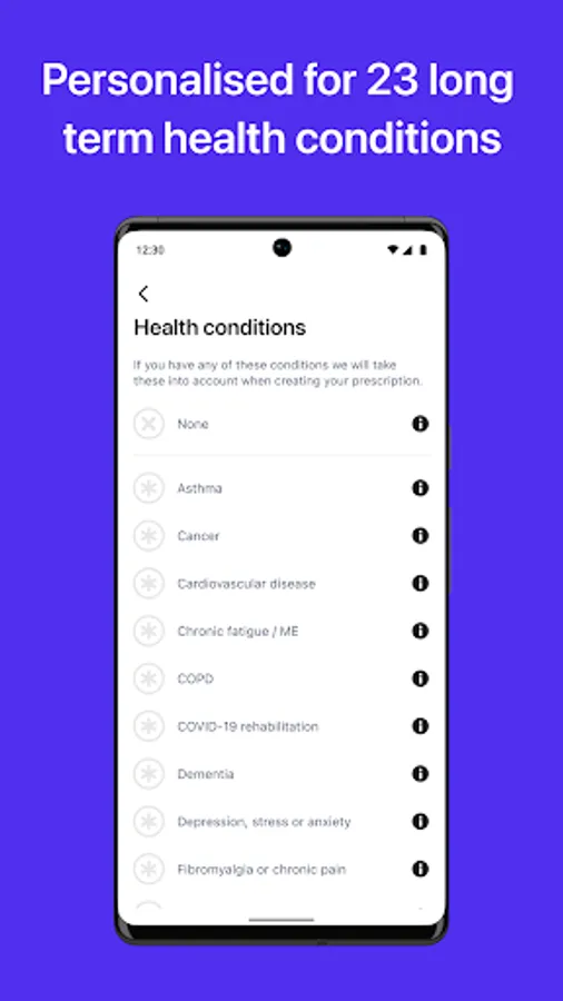 Designed for people at risk of or with any number of 23 chronic conditions, including cardiovascular disease, Type 2 Diabetes, anxiety and Cancer. We use the health information you enter when setting up your account to build the most appropriate exercise prescription for your needs.