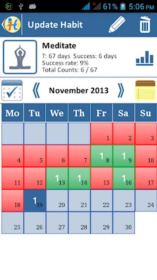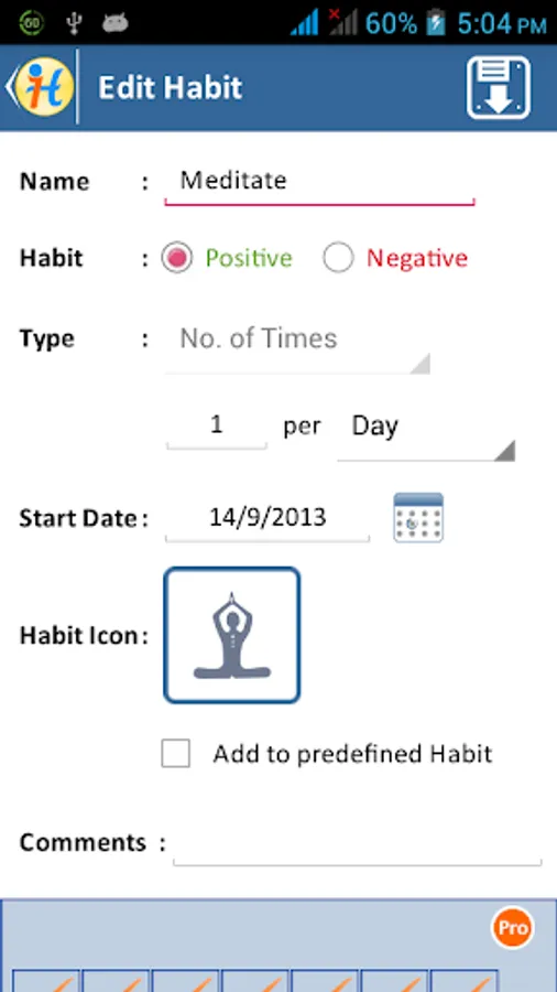 • Habit can be marked as Positive or Negative and system will show progress according to the same.