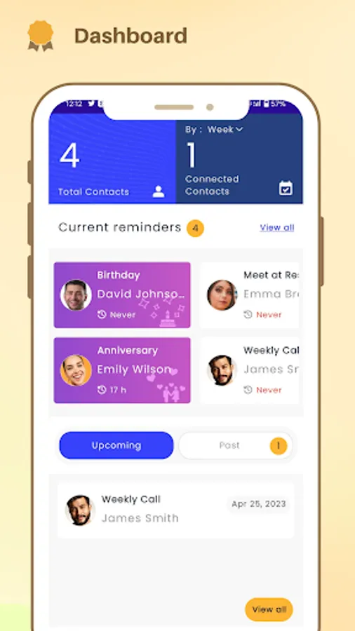 ✴ Dashboard: Our easy-to-use dashboard provides an overview of all your contacts, upcoming events, and reminders. It helps you stay organized and on top of your network.