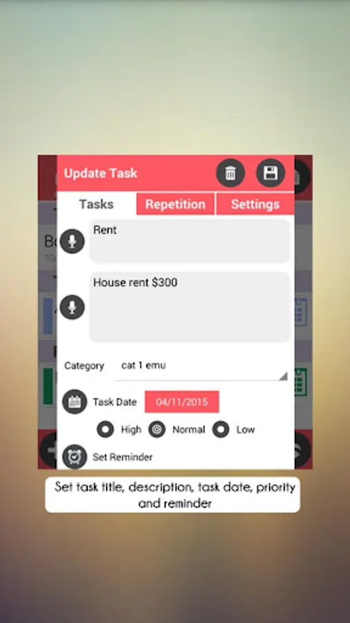 • Repeating tasks with reminders(daily,Weekly,Monthly,Yearly)