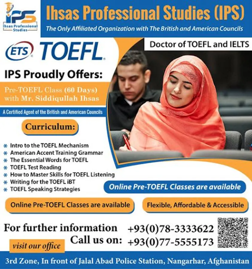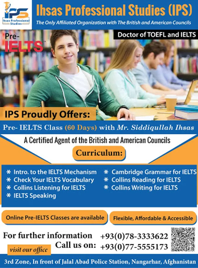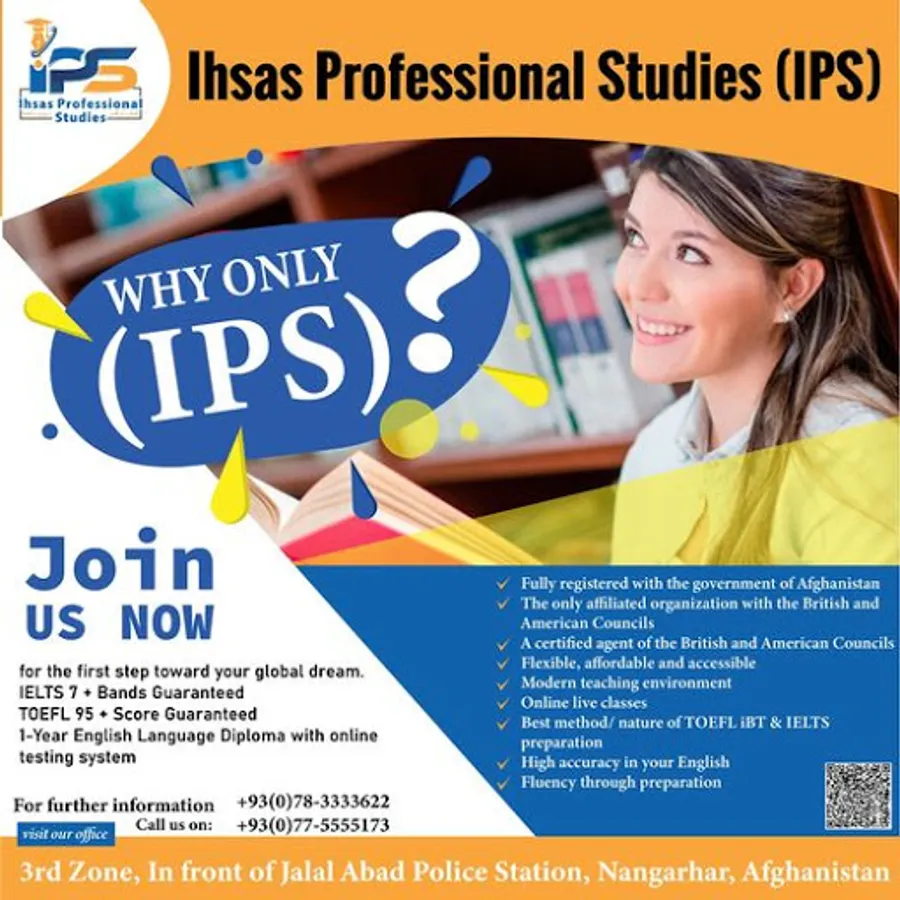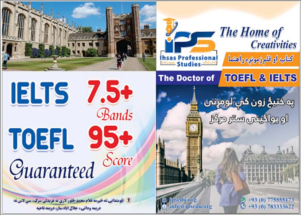 IPS, the only IELTS & TOEFL specialized organization that is fully registered with the ministry of education, guaranteeing your desired score for the first time ever appeared in Afghanistan. After 6-year consecutive research in the heart of Asia and beyond, the philosophy doctors of English literature finally established such standardized professional institute.