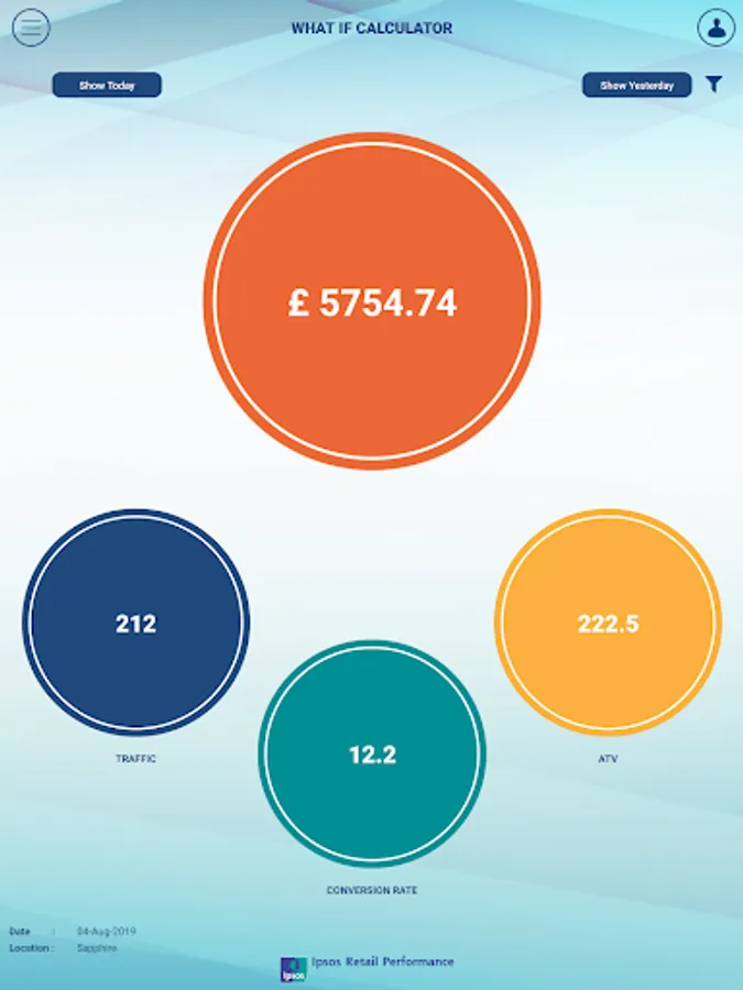 Use the customisable menu to choose the data you want to see; yesterday’s footfall, conversion rates, average transaction value*