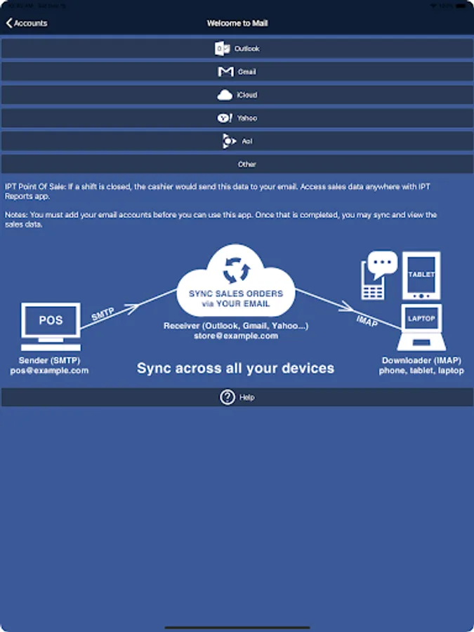 Notes: You must add your email accounts before you can use this app. Once that is completed, you may sync and view the sales data.