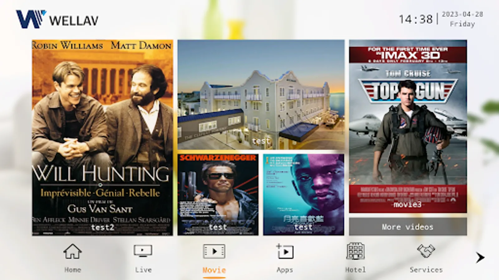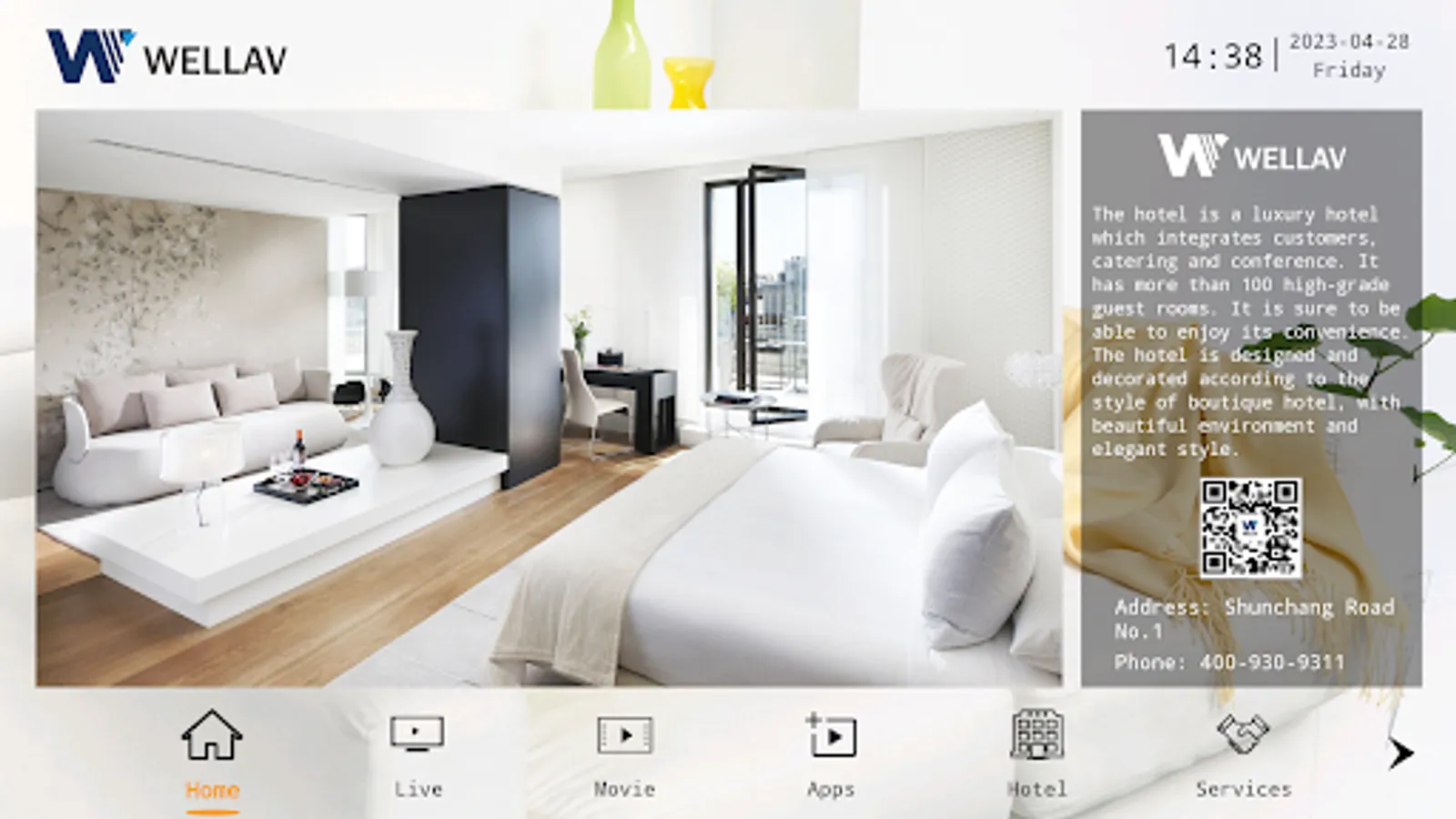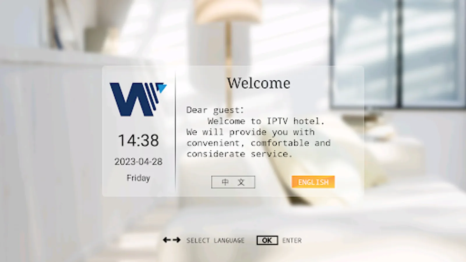 This is a hotel IPTV application software that supports real-time live broadcasting, poster customization interface functions, and also supports hotel check-in customer information to display welcome words