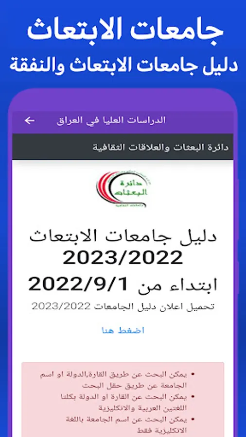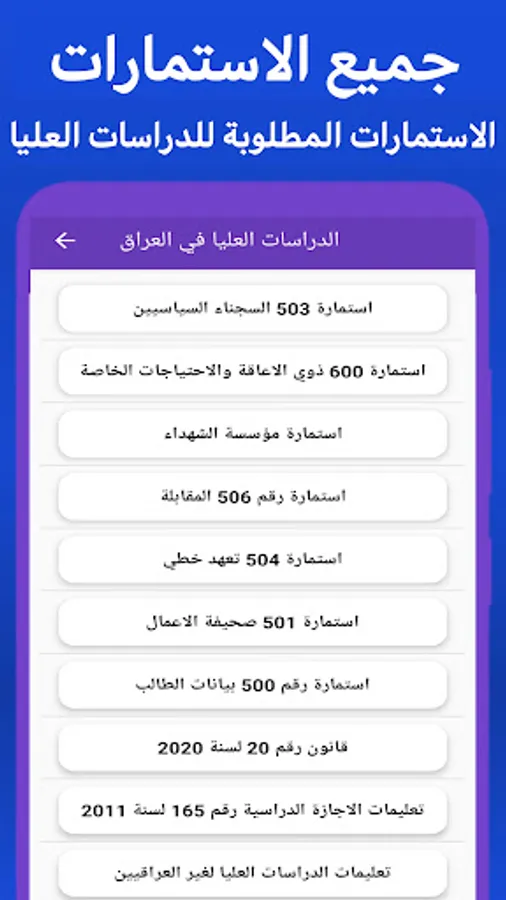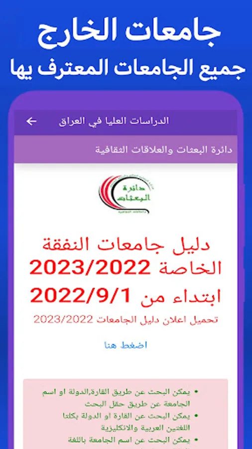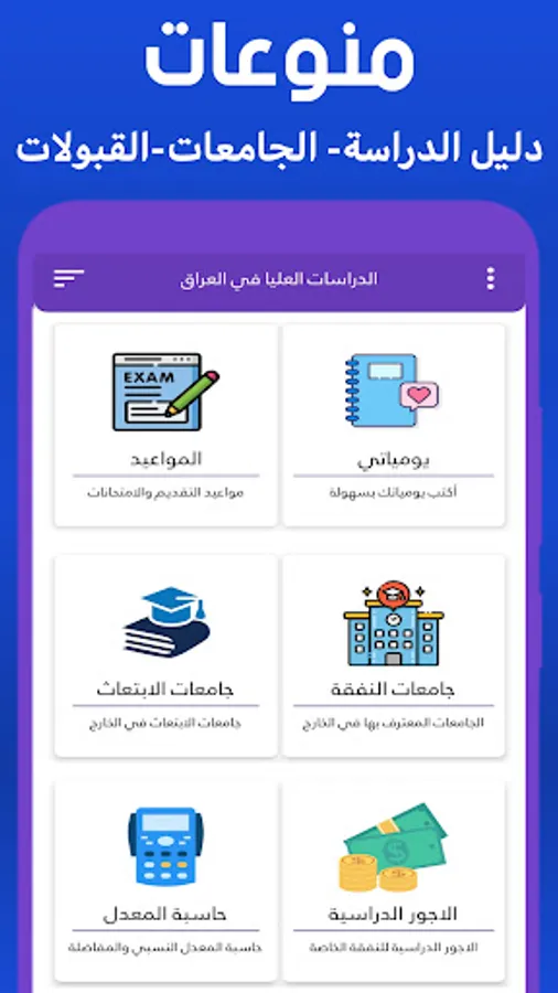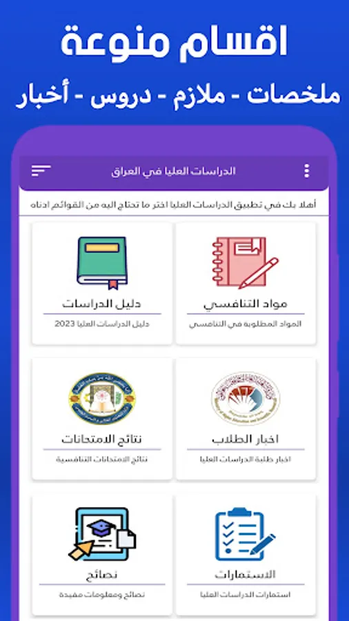 The application of postgraduate studies in Iraq is the first comprehensive application that provides everything the Iraqi student needs. The application contains: