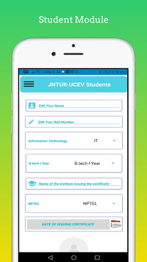 JAWAHARLAL NEHRU TECHNOLOGICAL UNIVERSITY VIZIANAGARAM has established INTERNAL QUALITY ASSURANCE CELL(IQAC) which is a significant administrative body that is responsible for quality matters.The prime responsibility of IQAC is to initiate,plan and supervise various activities that are necessary to enhance the quality of the education imparted in our institution.students can upload their ACHIEVEMENT, MERIT AND HONOUR CERTIFICATES in IQAC app which will be supervised by the principal to strengthen incentives of students effort and learning.