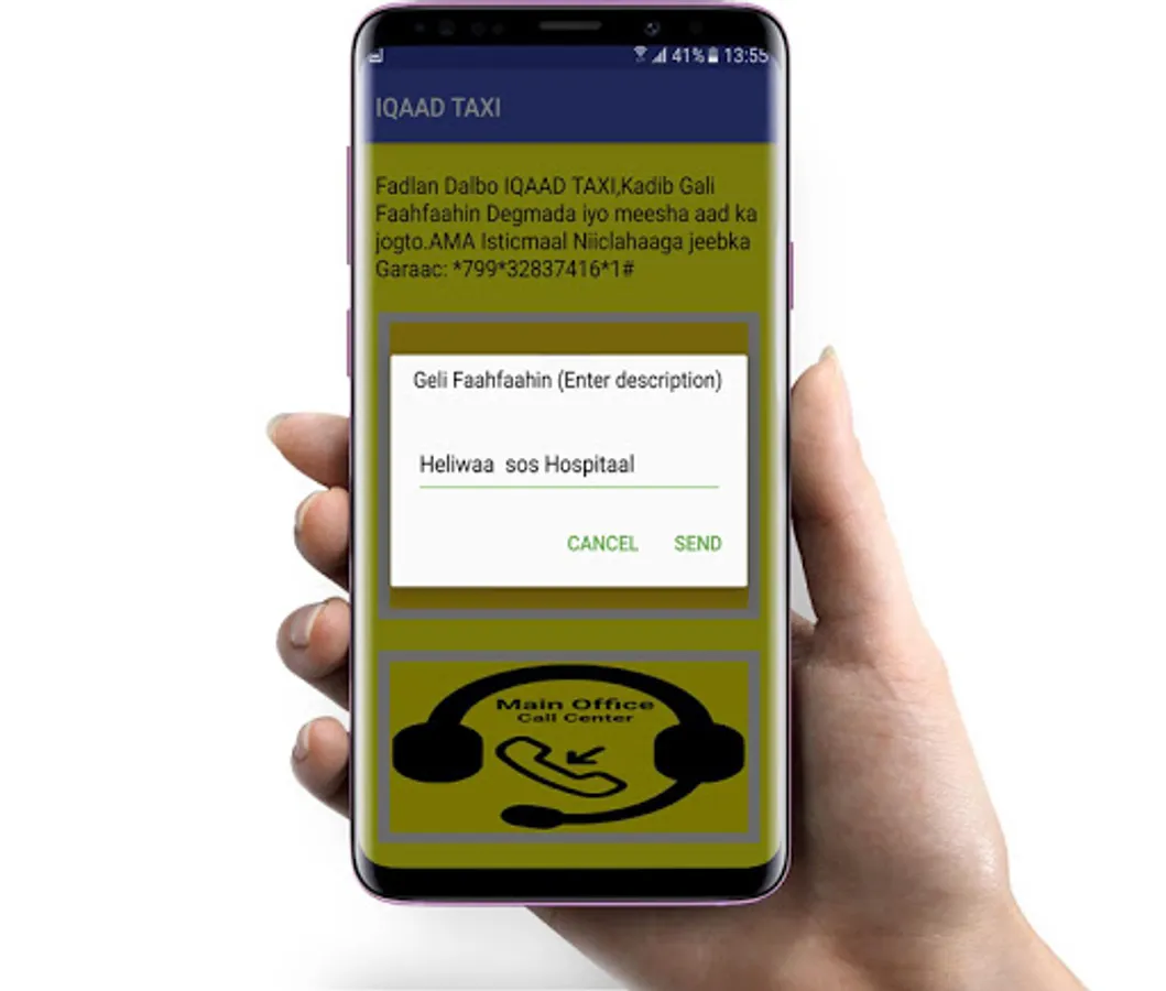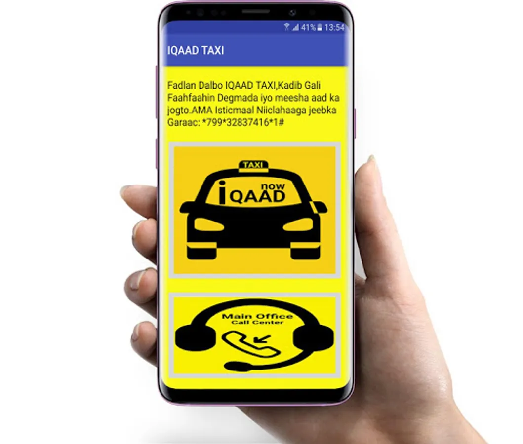 IQAAD TAXI waxa uu ku shaqeenaya Internet la'aan kuma qasbanid inaad Intenet Lacag ku shubatid sidoo kale IQAAD TAXI Application waxuu leyahay call center .