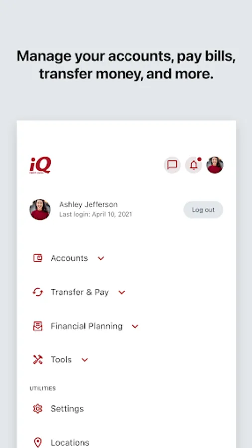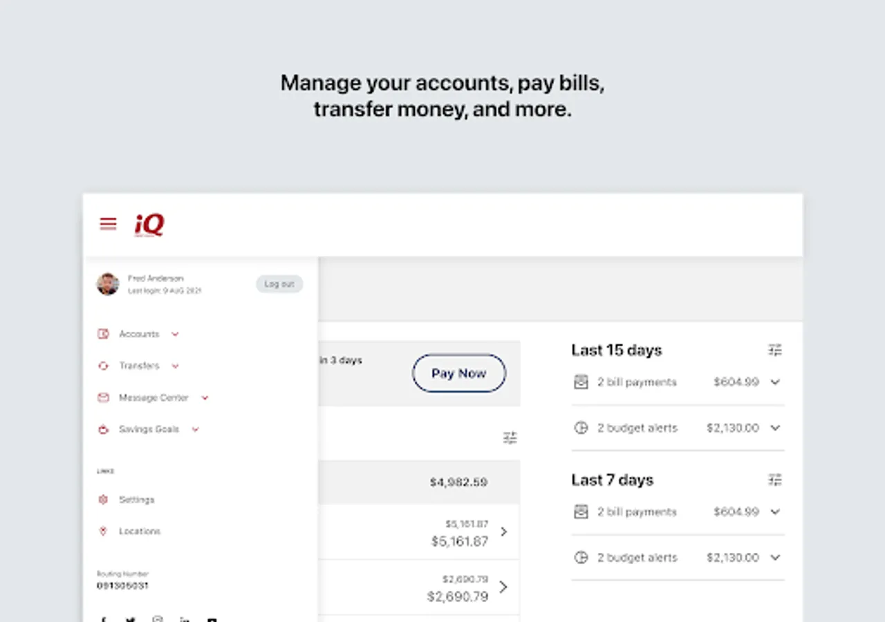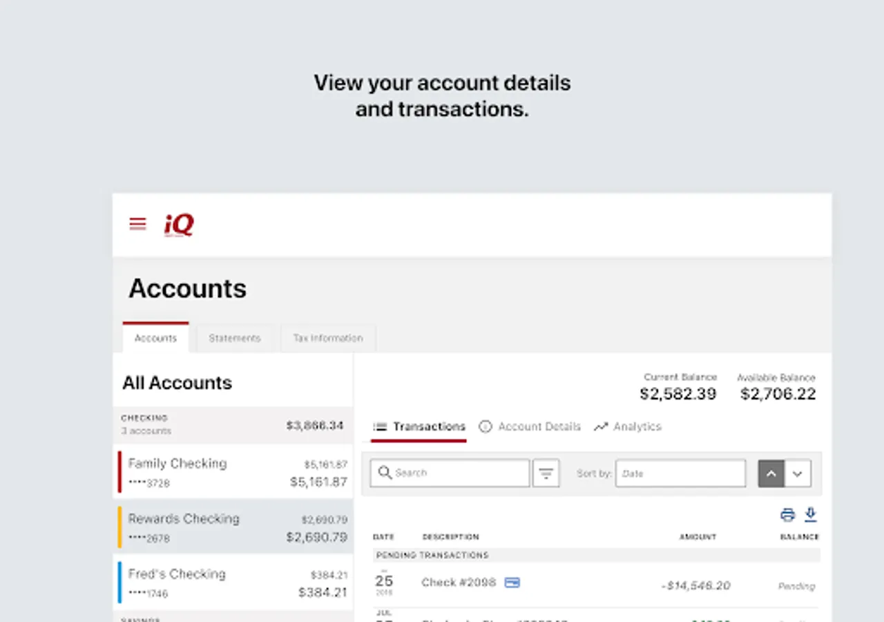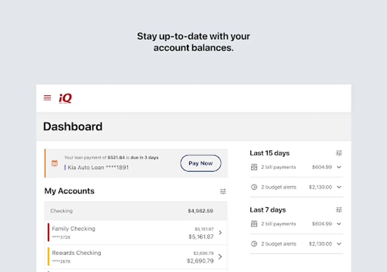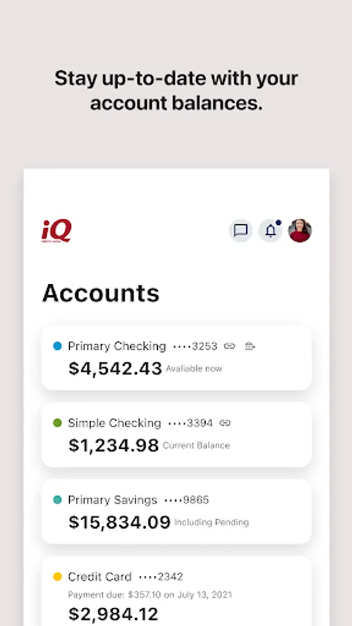 The iQ mobile app allows you to check balances, view transaction history, transfer funds, and pay bills on the go!