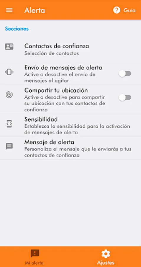 1. Button to generate an alert by sending your location when you are in a situation of violence and / or emergency to contacts previously defined as your trusted group.