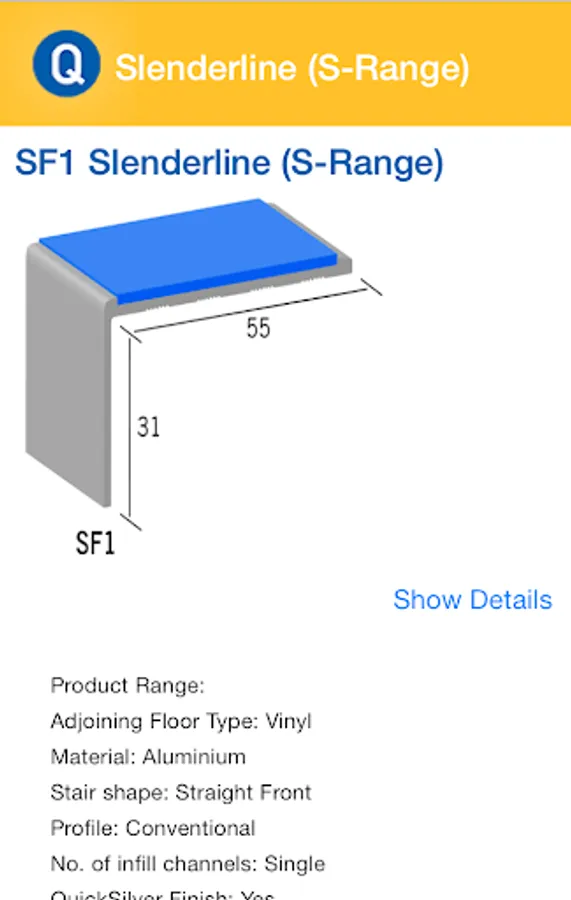 The Quantum flooring Phone specific application will enable you to able to identify and install the correct flooring accessories including stair nosings, PVC accessories, trims and transition profiles.