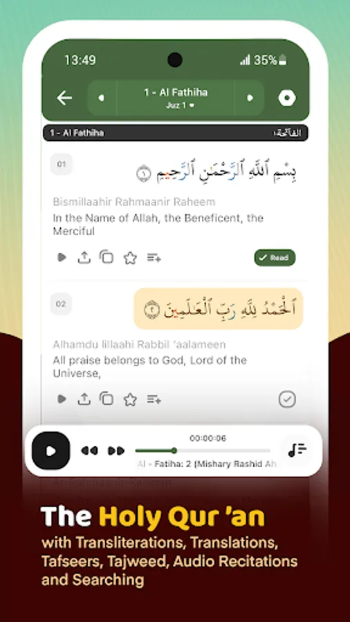 • 'Follow Reciter' feature to listen to the Quranic recitation followed by the Translation recitation.