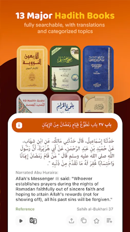 • 'Hadith Collection' section, containing complete Arabic Hadiths text & their translations for the 13 major Hadith books. Hadith section also supports searching.
