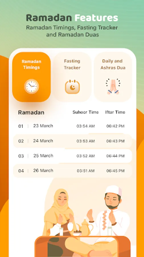 • View accurate Ramadan Suhoor & Iftar timings. Use Fasting Tracker to keep a track of your missed & observed fasts. Print hi-resolution Ramadan timetable. Suhoor, Iftar & Daily Ramadan Duas.