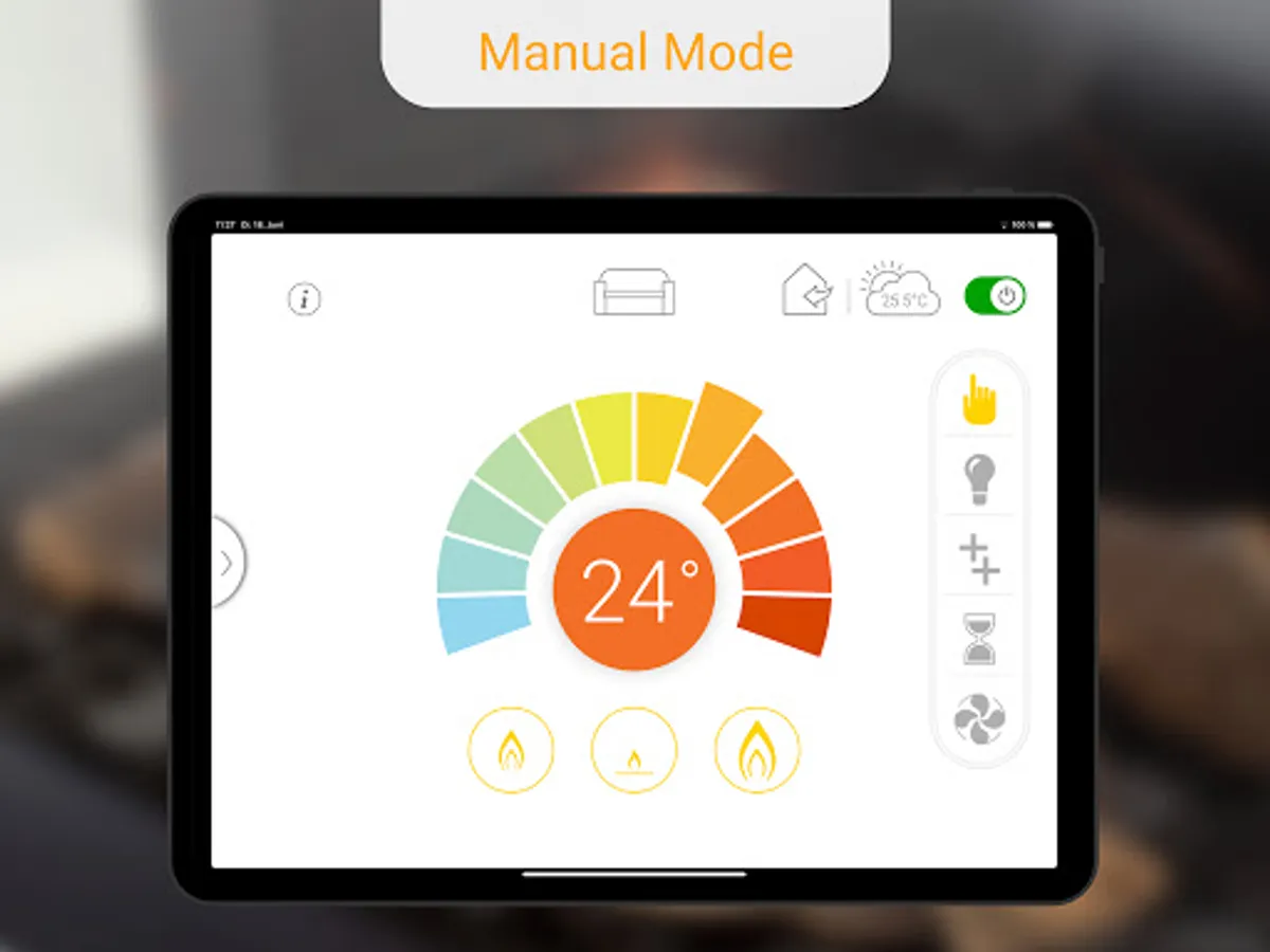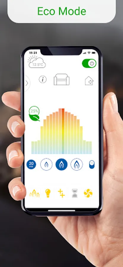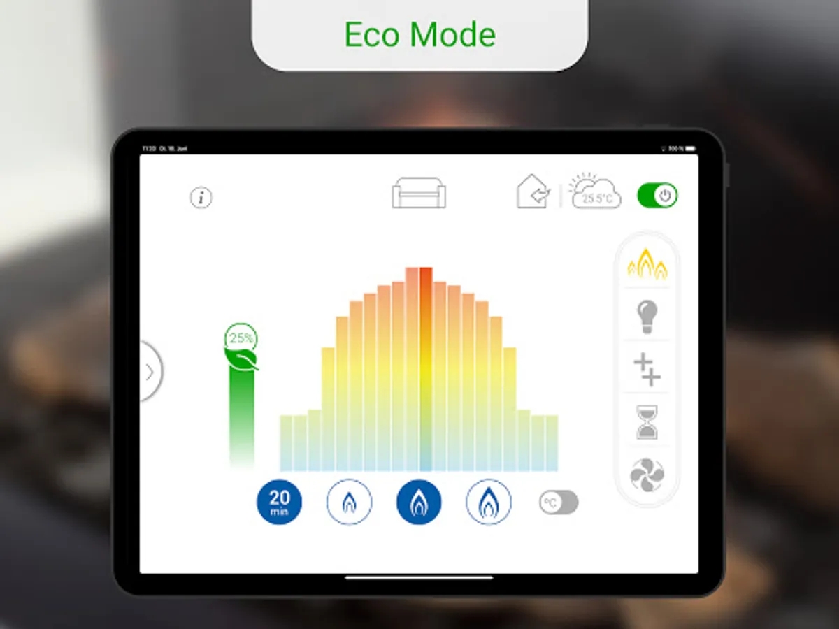 Furthermore, attika Fire offers an energy saving Eco Mode, the auto-comfort Thermostatic Mode, and a Program Mode that allows you set the ON/OFF times and temperatures. And save all your favorite settings using the Profile Mode.