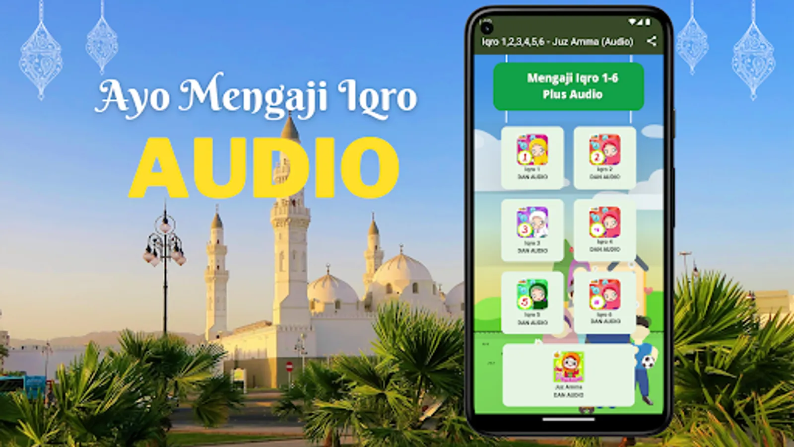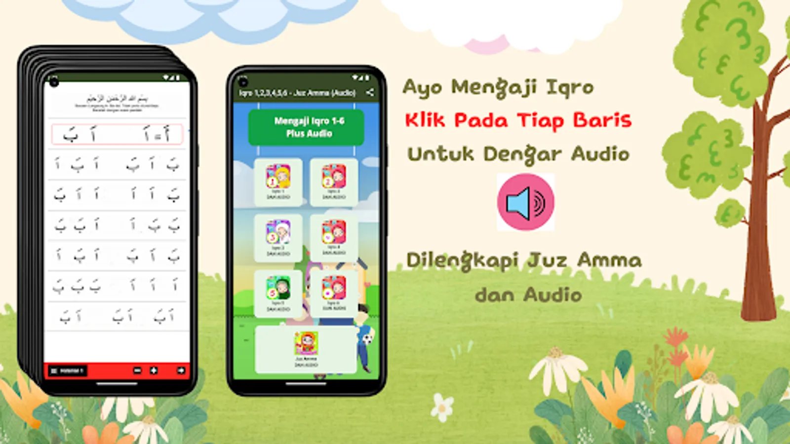 - Iqro' 1: Learning Hijaiyah letters from Alif to Yes, with reading fathah ('a') equipped with Audio.