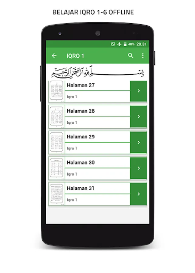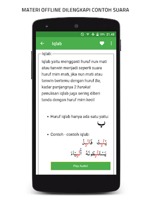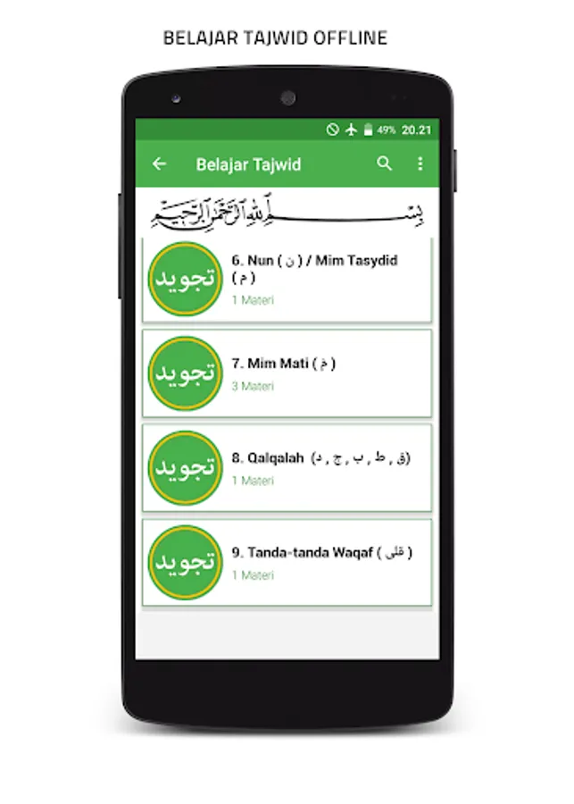 the material in this application includes iqro from 1-6 and tajwid. in addition there are also learning materials to recognize hijaiyah letters and numbers (complete with examples and sounds)