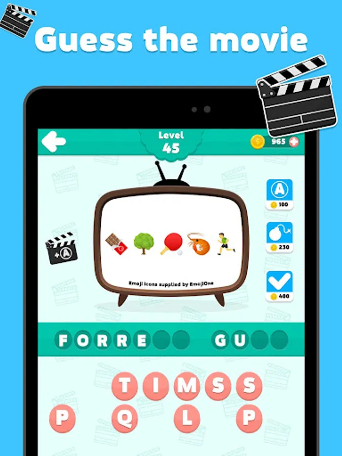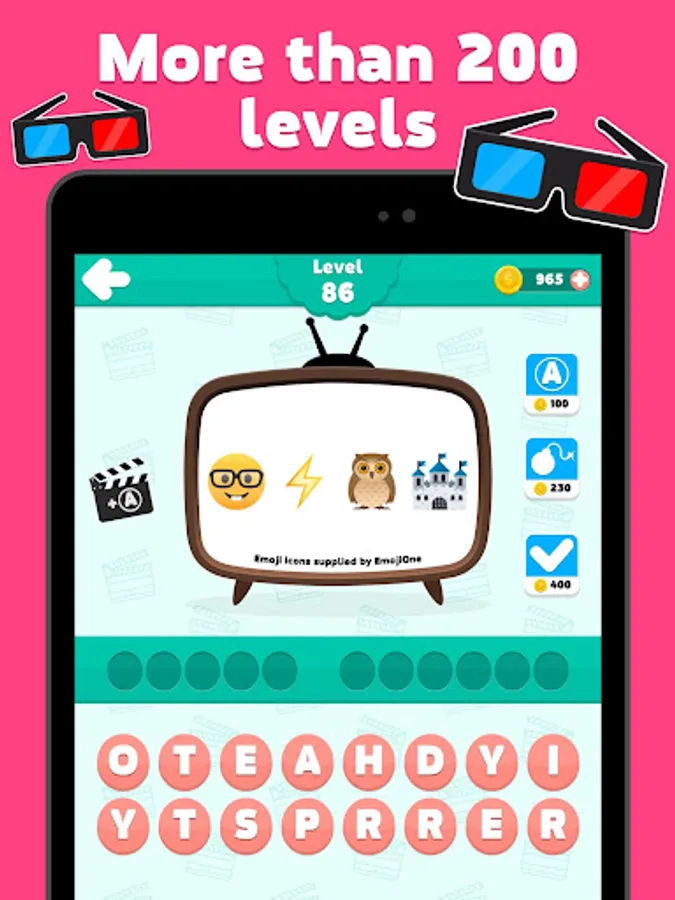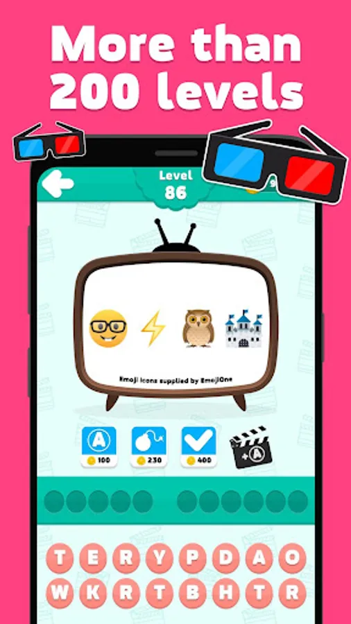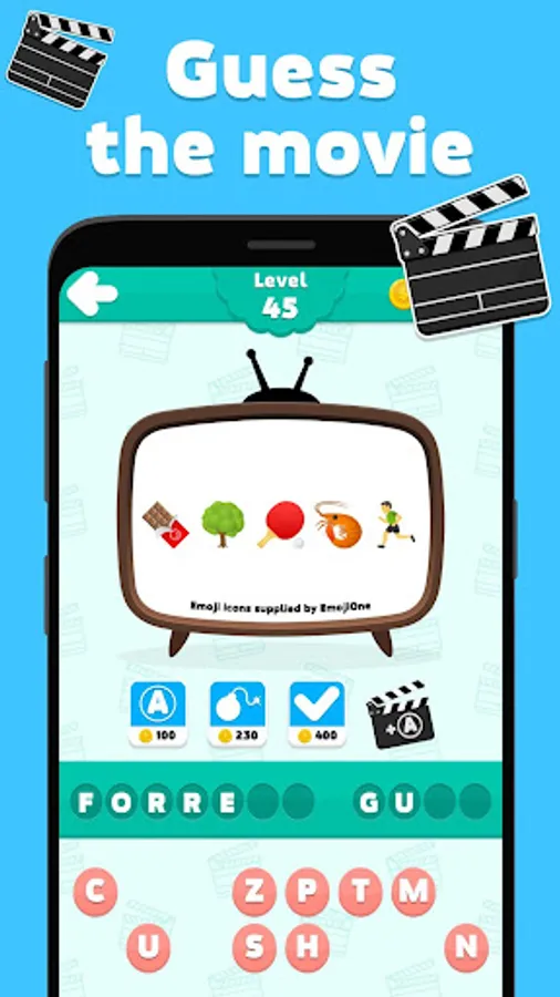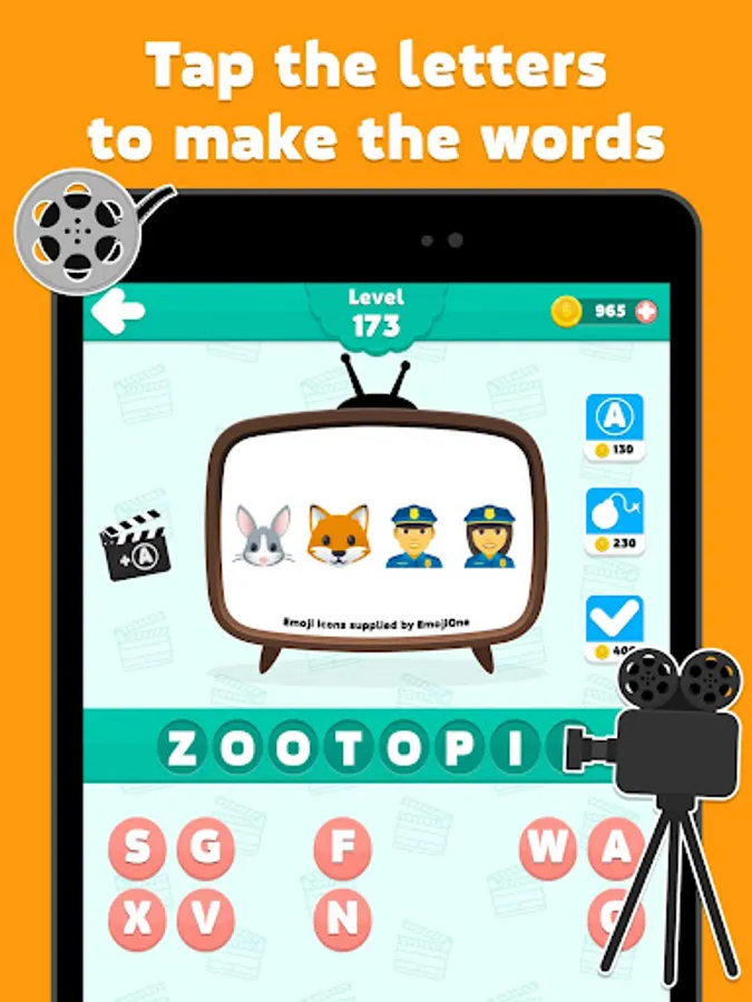 Guess the movie - emoji quiz is an addicting word puzzle game you can play alone or with friends! With free brain games, exciting picture packs, challenging word puzzles and tons of word puzzle games to play, you'll have endless hours of brain training fun! Guess the word, earn coins & train your brain wherever you are. Numerous achievements to record your game progress. Try to solve all the questions and complete all the levels!
