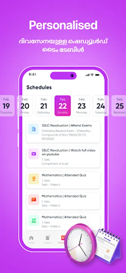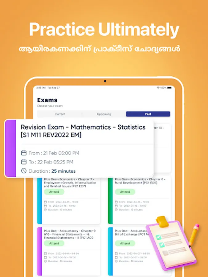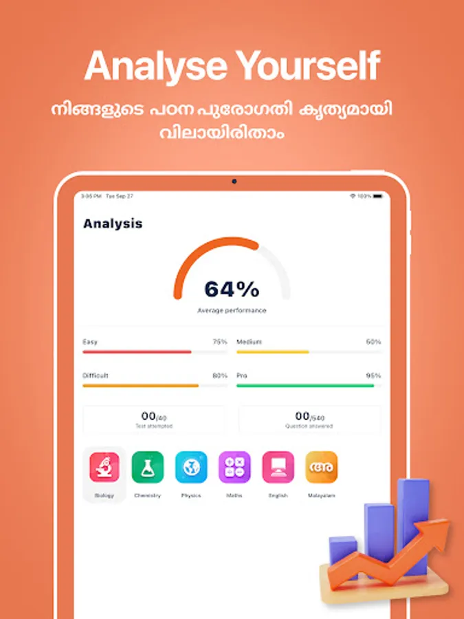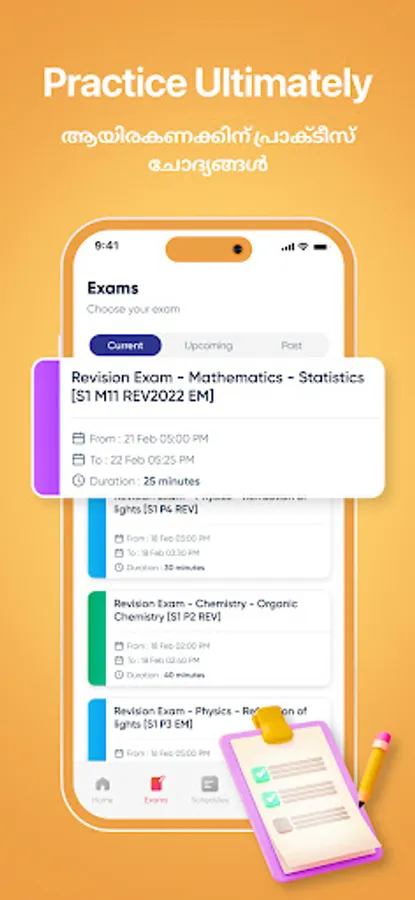 The students mastering of the subject will be tested in regular intervals through exams. Exams will be of the format of SSLC, Plus One board exams, KEAM, NEET, JEE models.