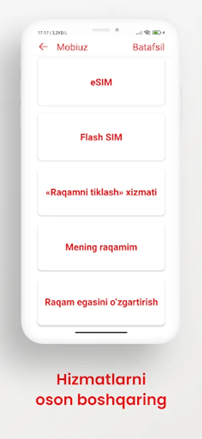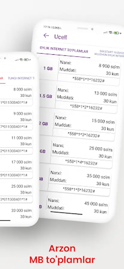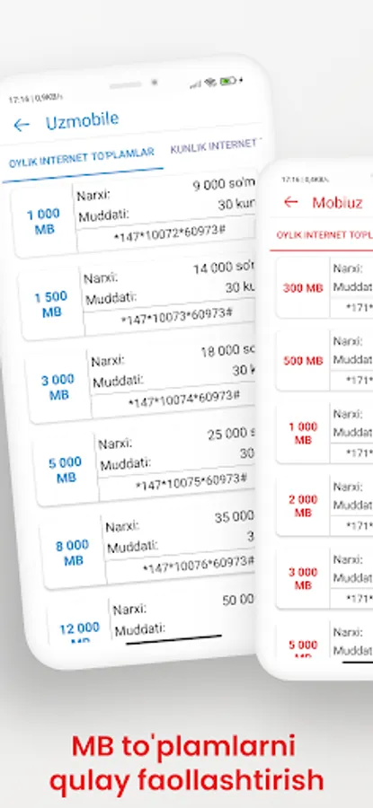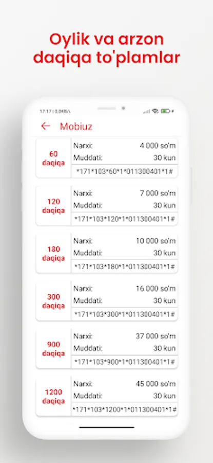This application contains USSD codes for mobile operators in Uzbekistan (Mobiuz, Uzmobile, Beeline, Ucell). Using the application, you can activate Tariffs, Internet packages, Minute packages, SMS packages and services through convenient ussd codes.