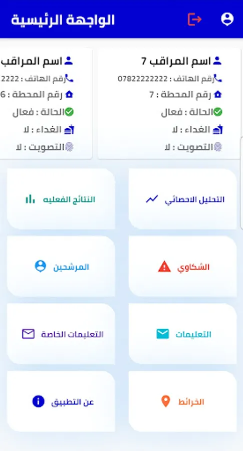 The application of the management of observers and anchors. Each observer or anchor in each electoral hall will have a comprehensive and easy-to-learn application that manages the electoral process on election day and raises both the observer and the anchor to the accredited system responsible for their supervision, where the application provides morning, noon and evening reports and submits to him the results of the candidates and results The actual form is in two forms, the first form is digital, where the sounds are recorded and transmitted through the observer or based in digital form, and the other form is by taking a picture of the biometric paper, and the observer can raise the complaint to his direct official via text or in the form of an image or video file, The application has the feature of recording the movements of the observer and the anchor every 15 minutes, even if he does not have the Internet, as the recording is done every 15 minutes and alerts him to return to the electoral center because he left the electoral district, which is within 100 meters. The application can also receive special and general instructions that be sent by the approved system.