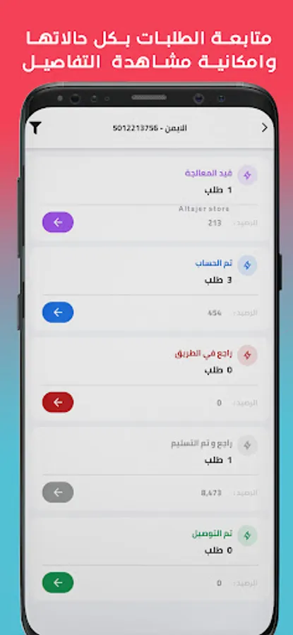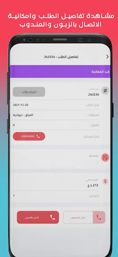 يمكنك متابعة الطلبات الخاصة بك من خلال التسجيل في التطبيق وبعدها فتح المستخدم وادخال رمز العميل الخاص بك لمتابعة كل الوصولات بكل حالاتها وامكانية السائق بالتحكم بحالة الطلبات و البحث والاستعلام عن الحالة للوصل مع نظام اشعارات عام لايصال حالة الطلب الى العميل