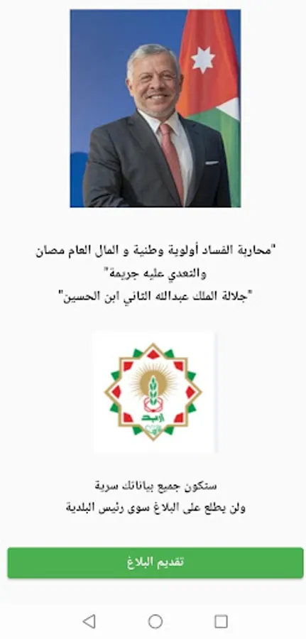 It is an application available to citizens of the Greater Irbid Municipality to report corruption and abuses in the Greater Irbid Municipality. Your report will be processed quickly and only the mayor will see your data. Your keenness and participation in preserving public money enhances the values of integrity and transparency and limits the waste of public money.