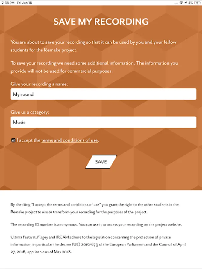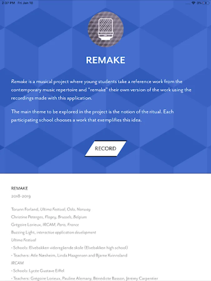 Re-make is the application used in the “Remake” project that is part of the Ulysses Network, which is supported by the Creative Europe program of the European Commission. It is based on the pedagogical philosophy of “learning by doing”. In this project young teenage students discover reference works from the classic modern repertoire such as The Rite of Spring by Igor Stravinsky or Hymnen by Karlheinz Stockhausen. The ideas and context of these works is explored together with the students’ teachers as well as composers and sound designers. Using the Re-make application, the students record and collect sounds that reflect the musical ideas and sounds found in the works. At the end of the project the students “re-make” the work by editing and “re-composing” the sounds in order to create their version of the work that reflects what they have learned.