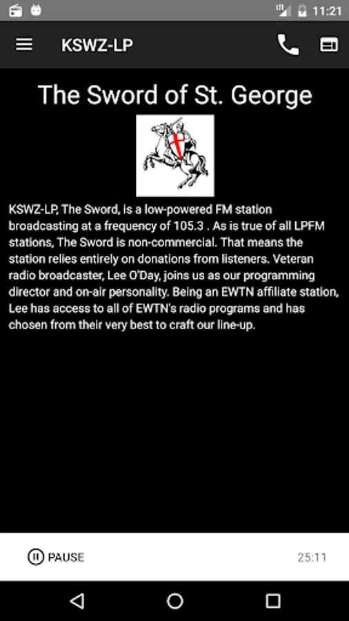 KSWZ-LP, The Sword, is a low-powered FM station broadcasting at a frequency of 105.3 . As is true of all LPFM stations, The Sword is non-commercial. That means it is publicly supported. Veteran radio broadcaster, Lee O'Day, joins us as our programming director and on-air personality. Being an EWTN affiliate station, Lee has access to all of EWTN's radio programs and has chosen from their very best of to craft our line-up.