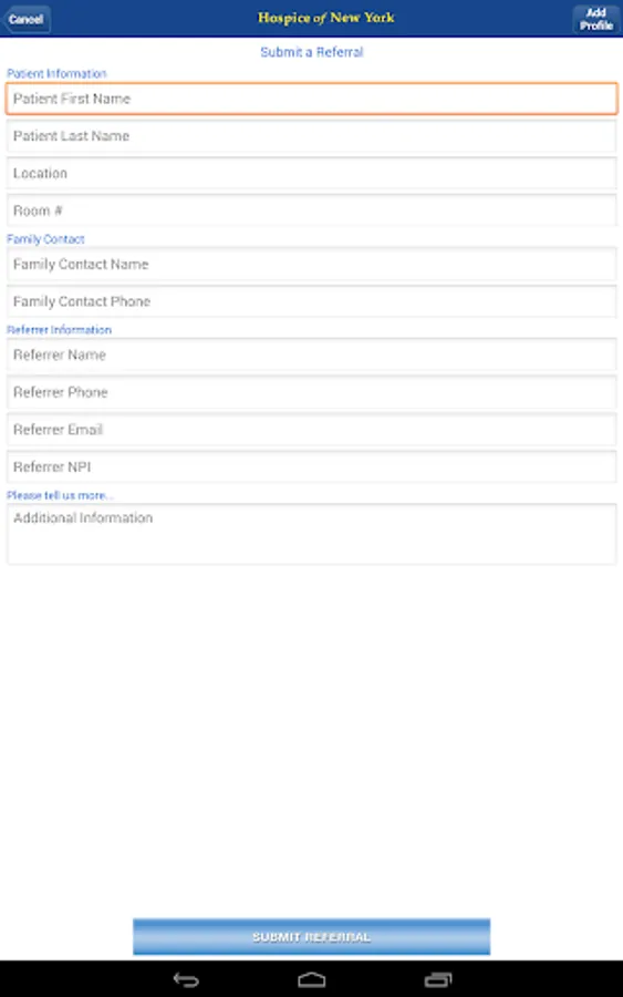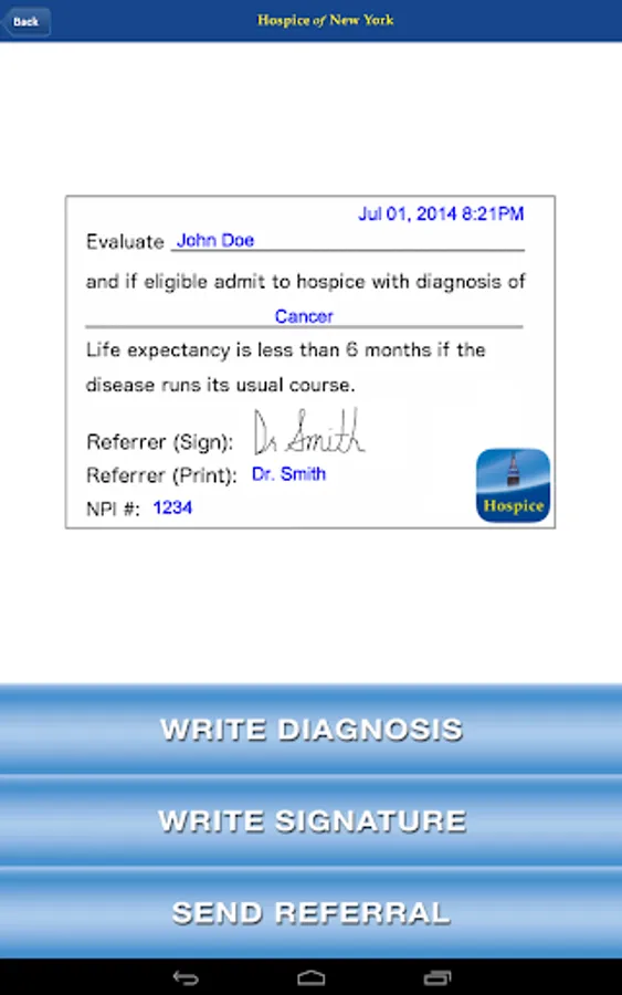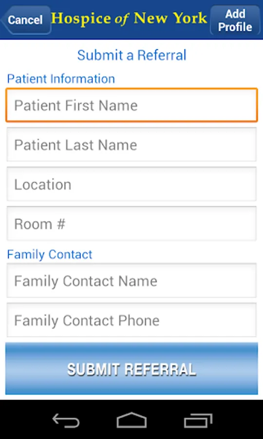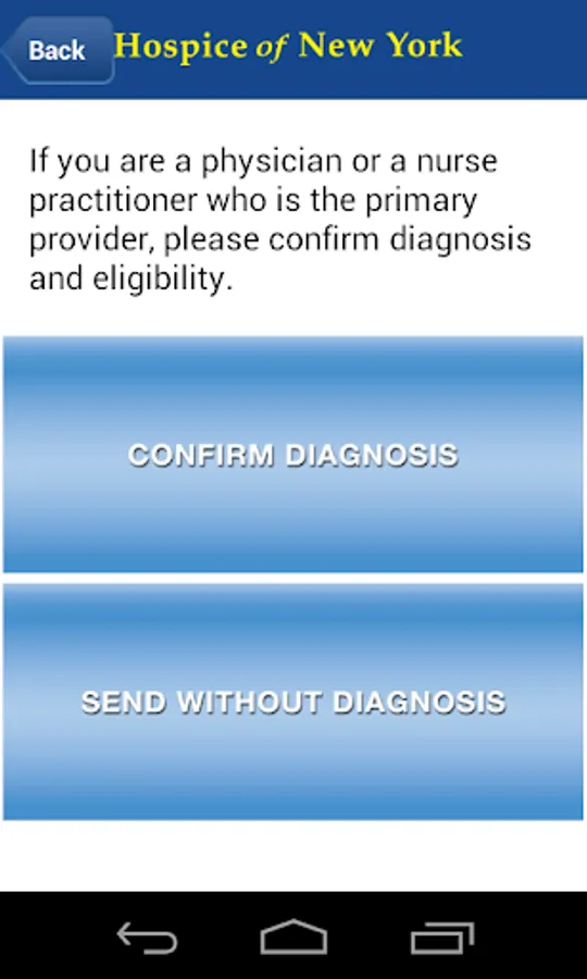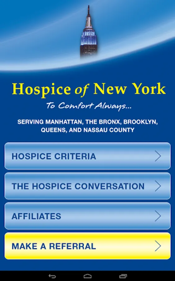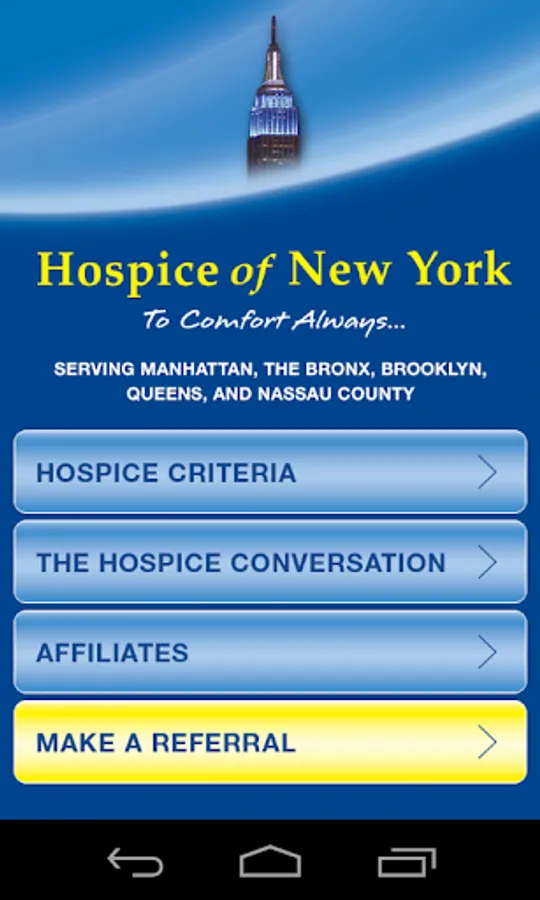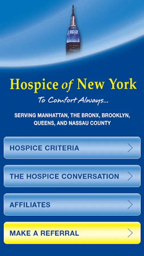 This hospice app provides a convenient way for healthcare providers to refer patients to the Hospice of New York. This app also provides information about clinical services provided by medical directors of the Hospice of New York. Healthcare providers will also find guidelines on hospice eligibility. Referrals submitted through the app will be received by the Hospice of New York's admissions office for expedient follow up. All information received through the referral form complies with and will be processed according to HIPAA regulations.