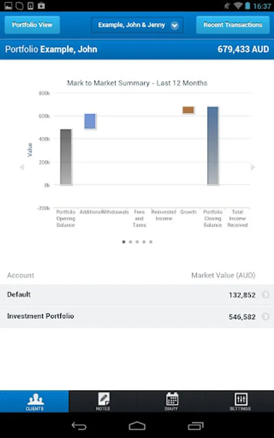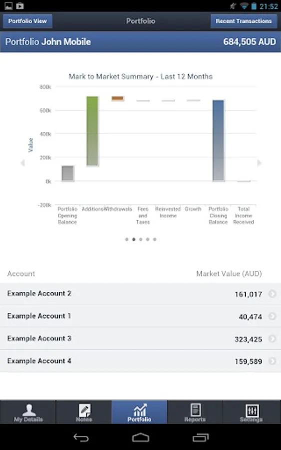 Interact with your portfolio data, including valuation, recent transactions and mark to market information.