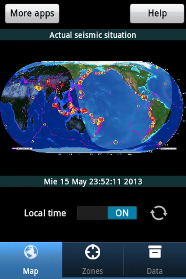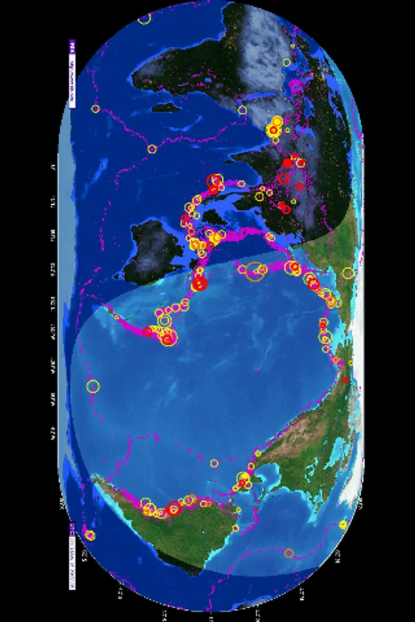 Global vision of the world sismic activity updated every 20 minutes. The red dots represent the events of the present day. Its size show the magnitude. Orange dots are activity on past days.