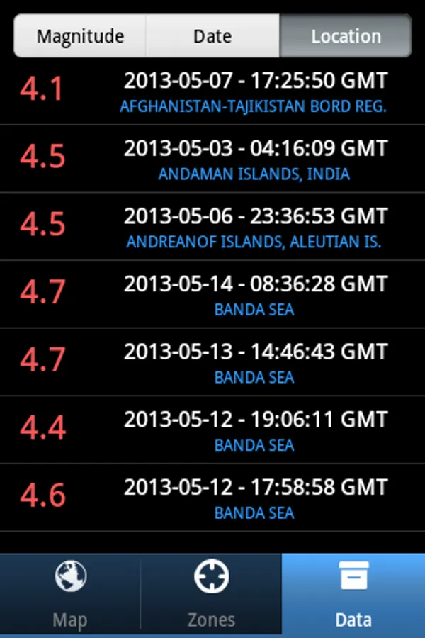 A third view with data ordered by magnitude, dates and locations of the earthquakes in recent months.
