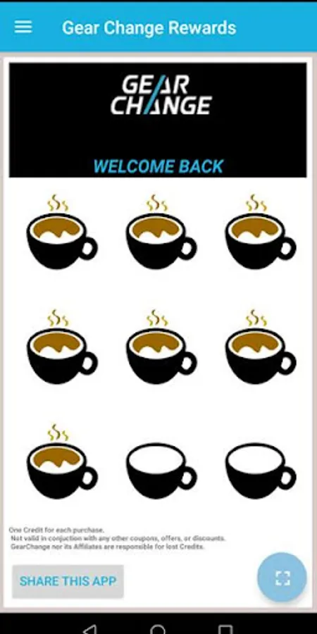 A rewards app for The Gear Change customers. Using your phones NFC or camera scanning abilities, you can get credits for each coffee you buy at the gear change coffee shop. You get a free coffee for every 10th coffee you buy!