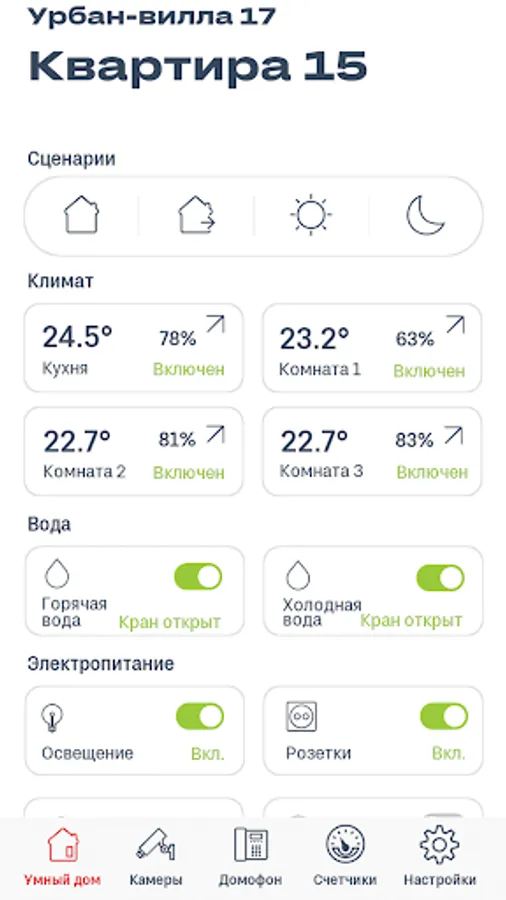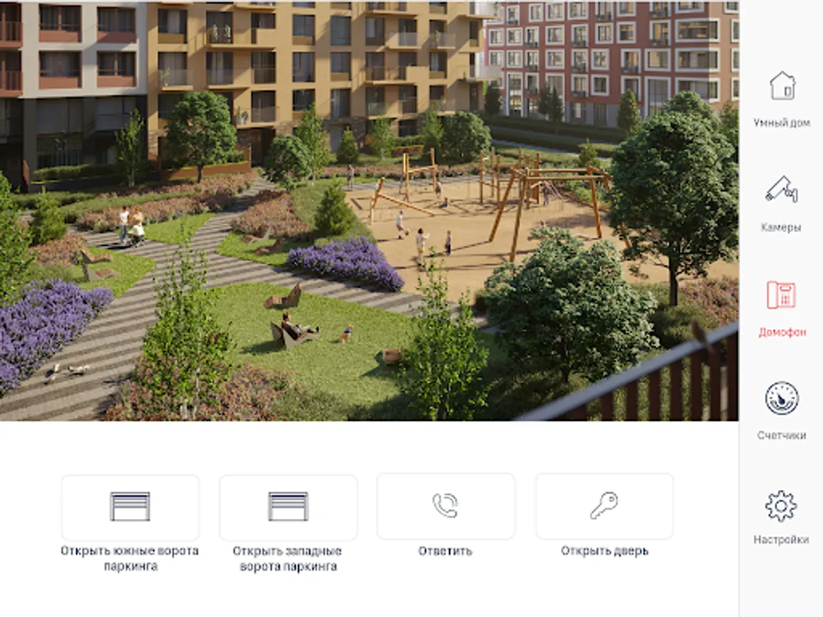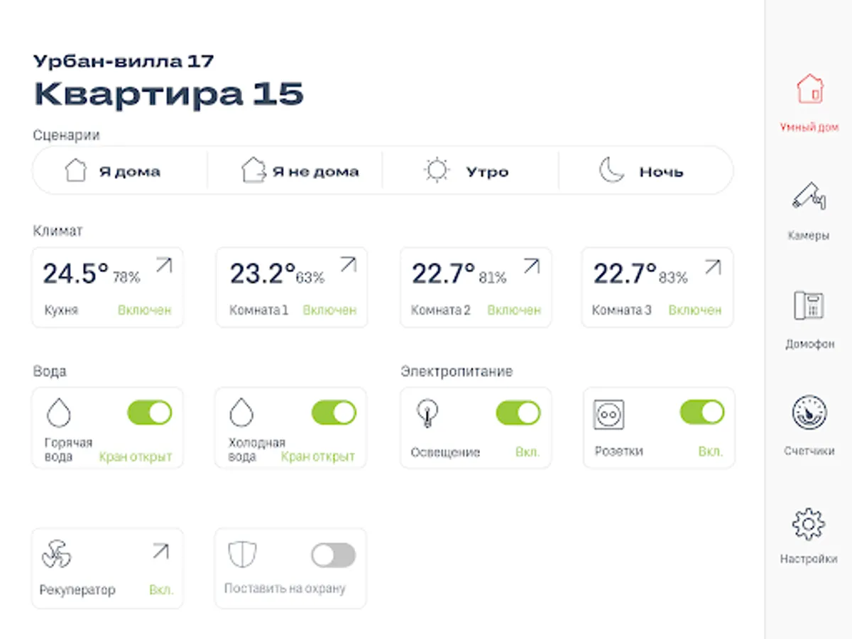 Application "Cowberry. Smart Home allows you to increase the comfort and safety of living, make monitoring of energy resources and interaction with the management company transparent. With its help, residents can remotely open the gates to the courtyard and monitor what is happening on the internal territory using video surveillance cameras, turn off the power of sockets and lights in one click, and view meter readings. Each apartment has leakage and penetration sensors and a climate control system responsible for the operation of ventilation and air conditioning.
