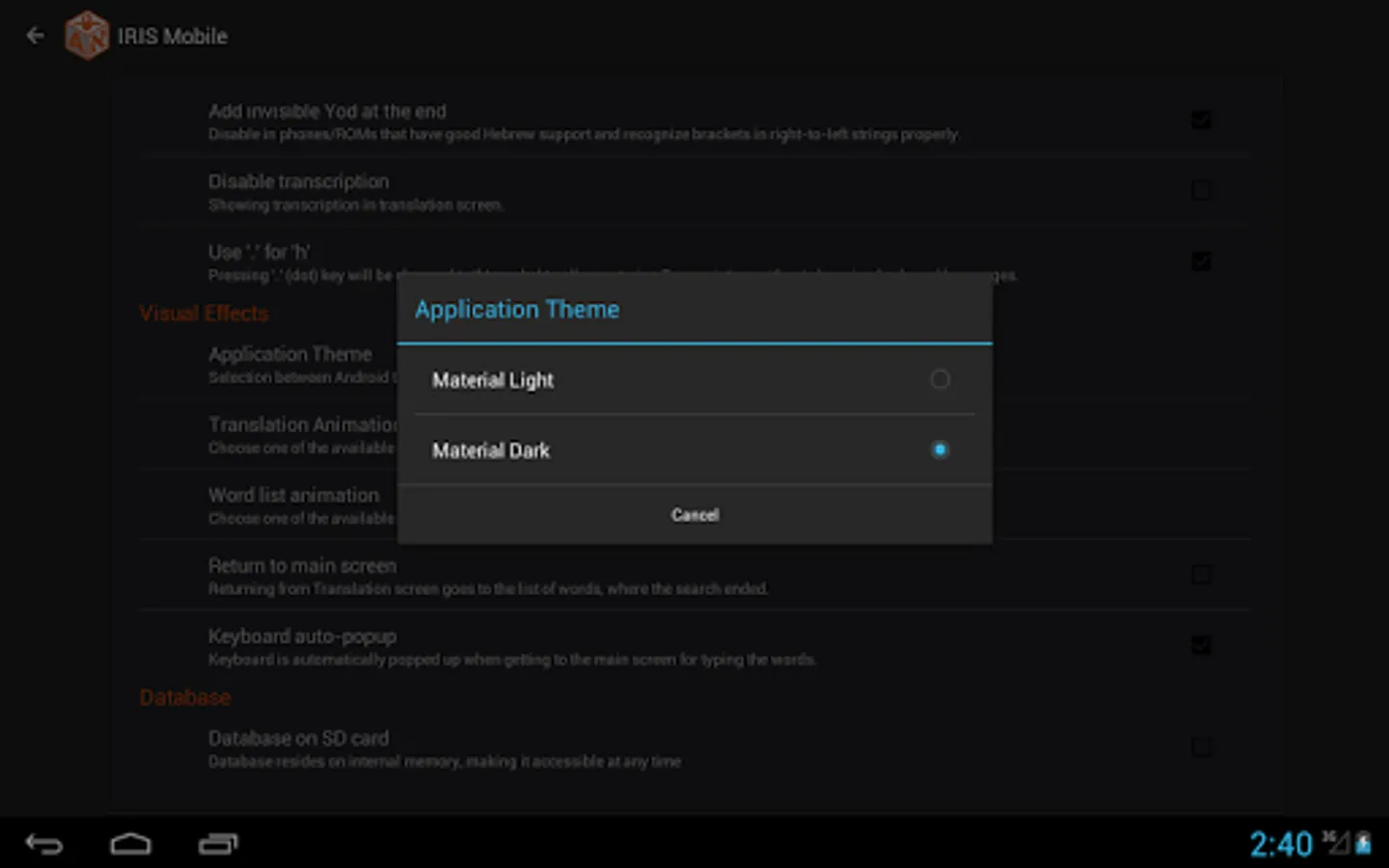 * Font size change (pinch-to-zoom and menu selector) on translation screen.
