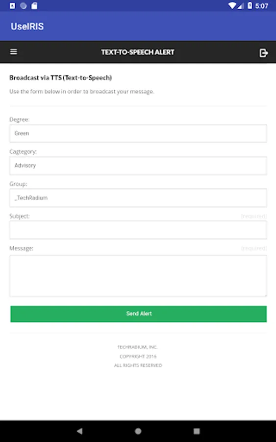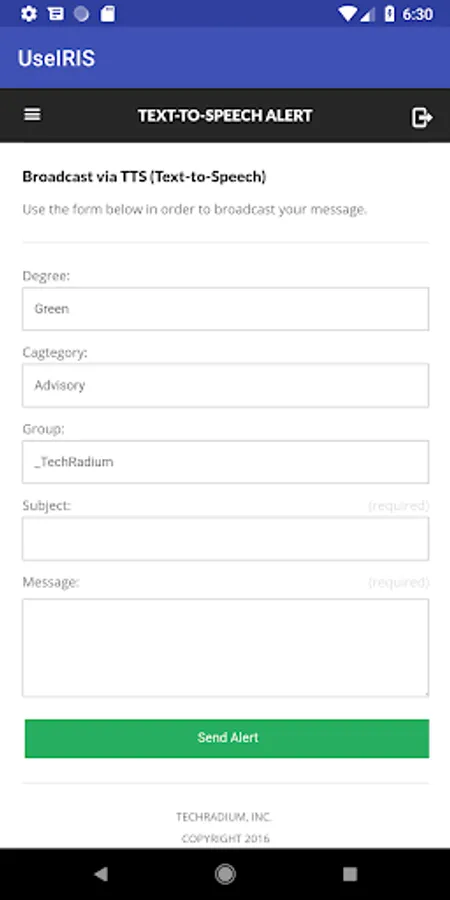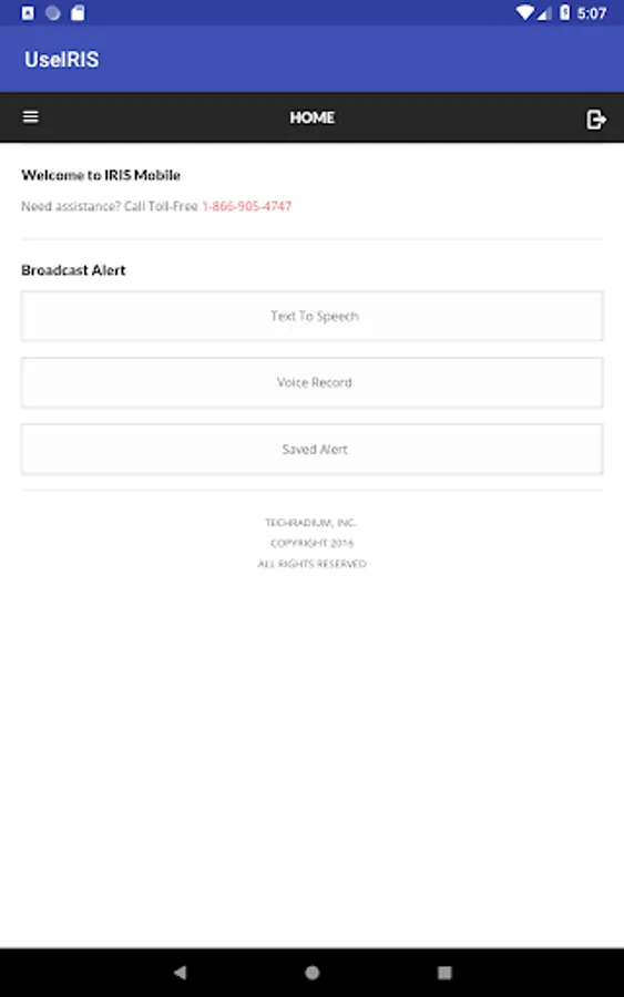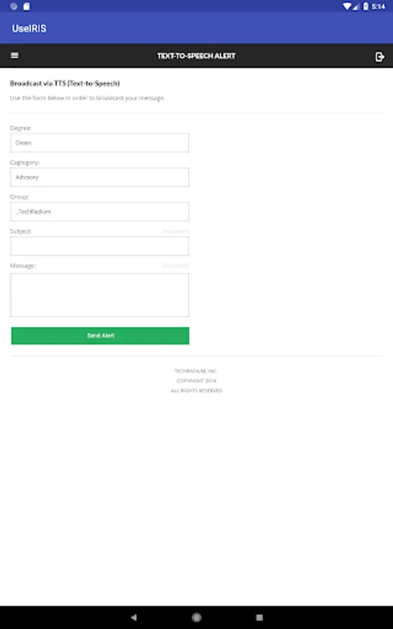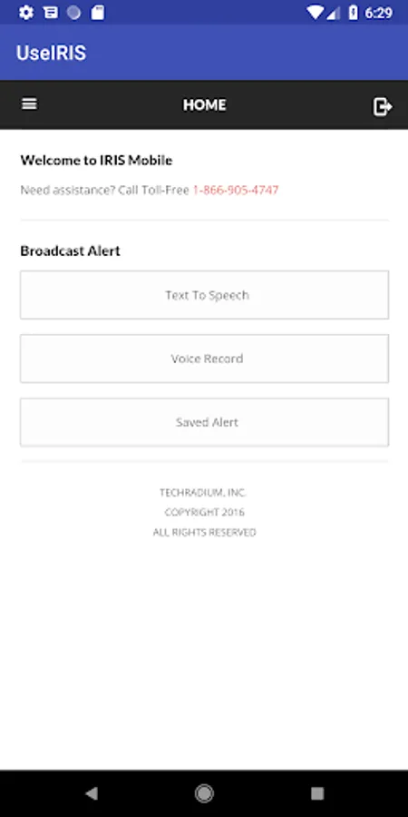 The app allows system and group administrators to quickly broadcast messages via the IRIS system. The message admins have the ability to quickly broadcast messages via Text-to-Speech, voice recorded alert or saved alert methods. These messages will then be delivered to the groups via SMS text, phone calls and email or combinations thereof. Upon sending an alert, admins can quickly view a report summary to see how many alerts have been delivered so far.