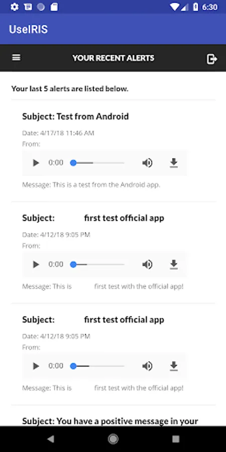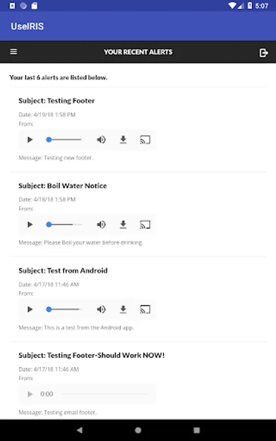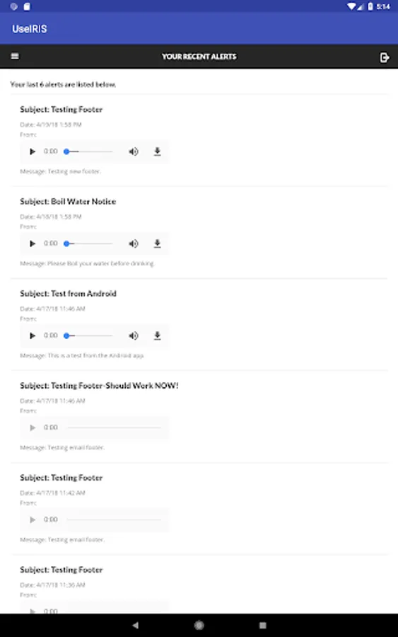 The app allows users to view and listen to the last ten alerts/messages they have received. If the "needs assistance" feature is activated, it allows the users to reply to messages, whether or not she or he needs assistance due to an emergency alert.