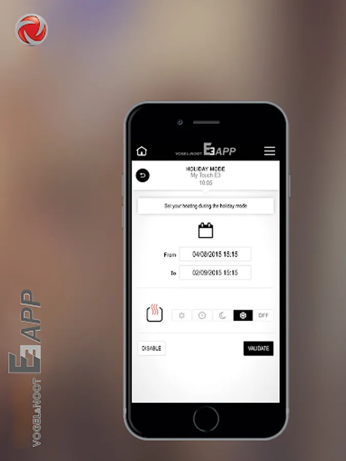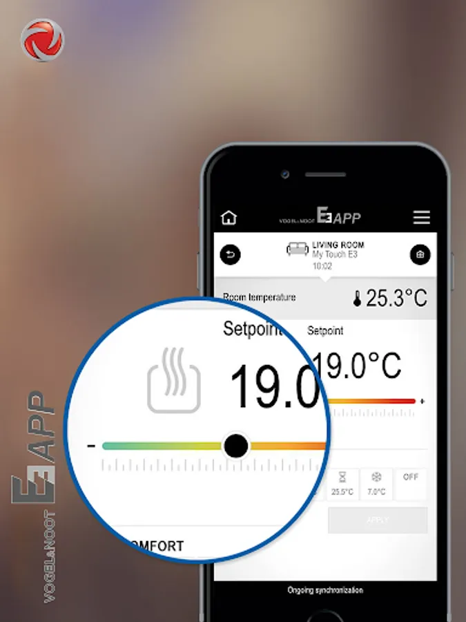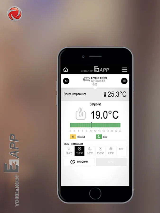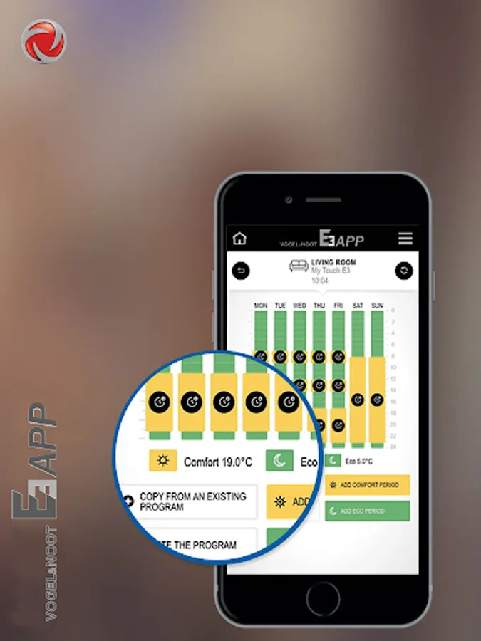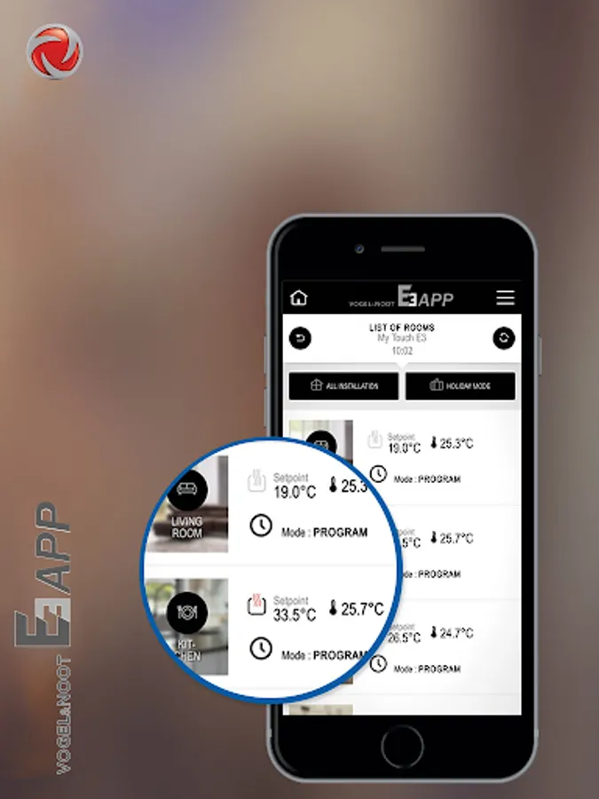 The Control E3 App allows you to remotely monitor and control your VOGEL&NOOT, MYSON and FINIMETAL heating system. Just connect your smartphone or tablet (WiFi) to your CONTROL E3 wireless central programmer. You can then easily change modes and corresponding temperatures, create and change day and week programs, set holiday dates for all connected appliances, rooms or zones. Improve your comfort while saving energy. The Control E3 App supports a wide range of our product portfolio. It is now also connectable to our under floor heating systems.