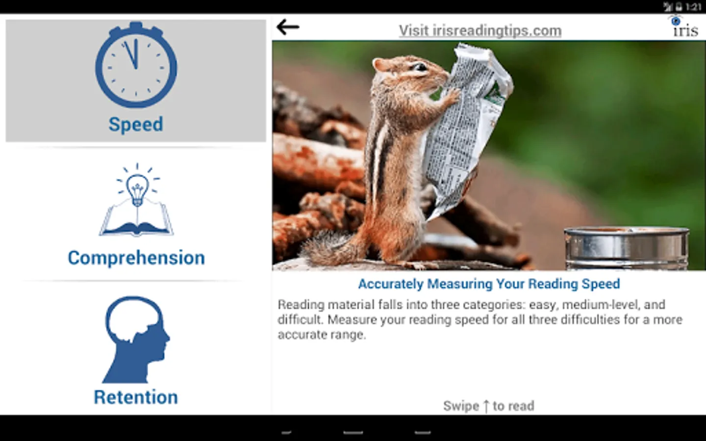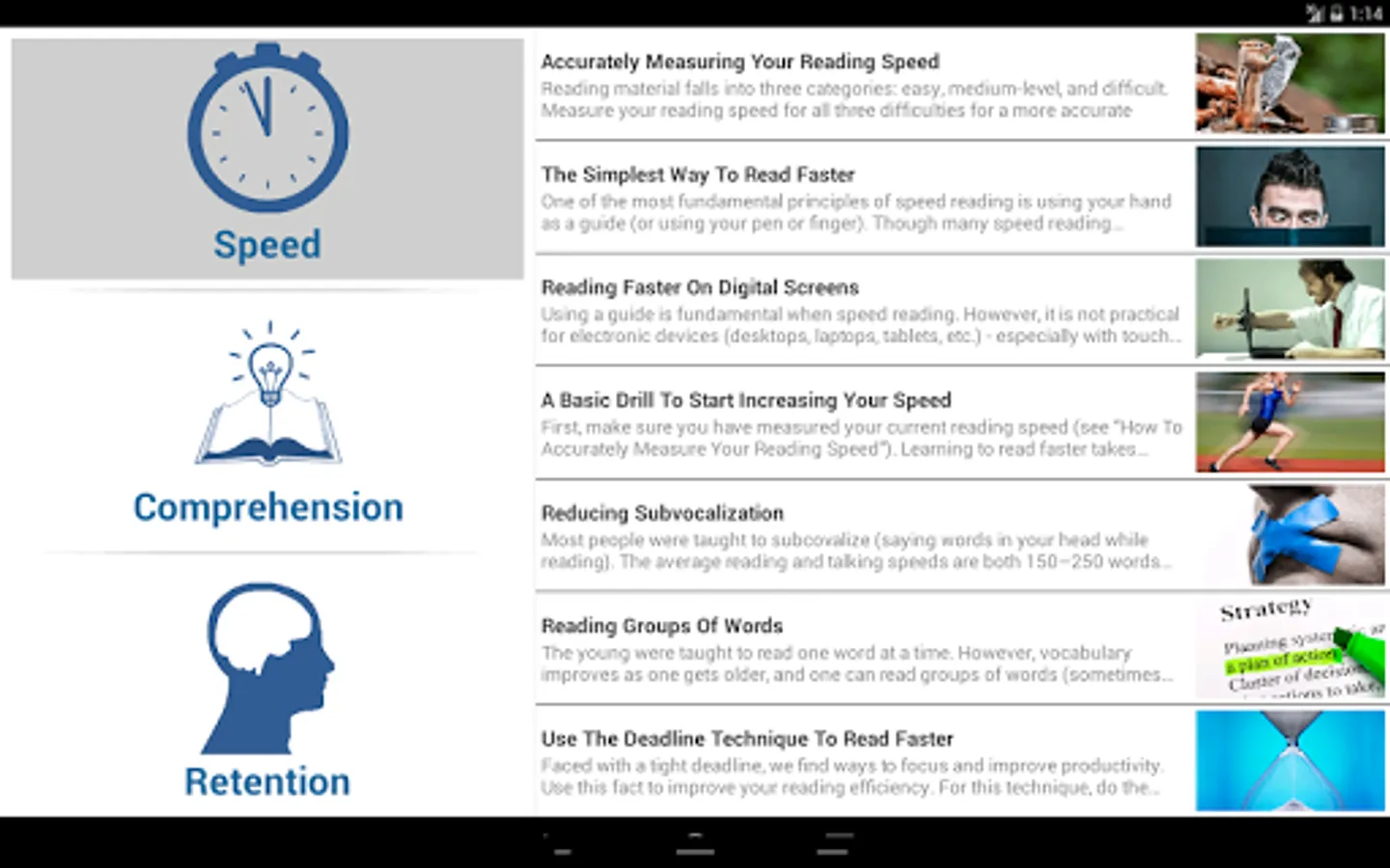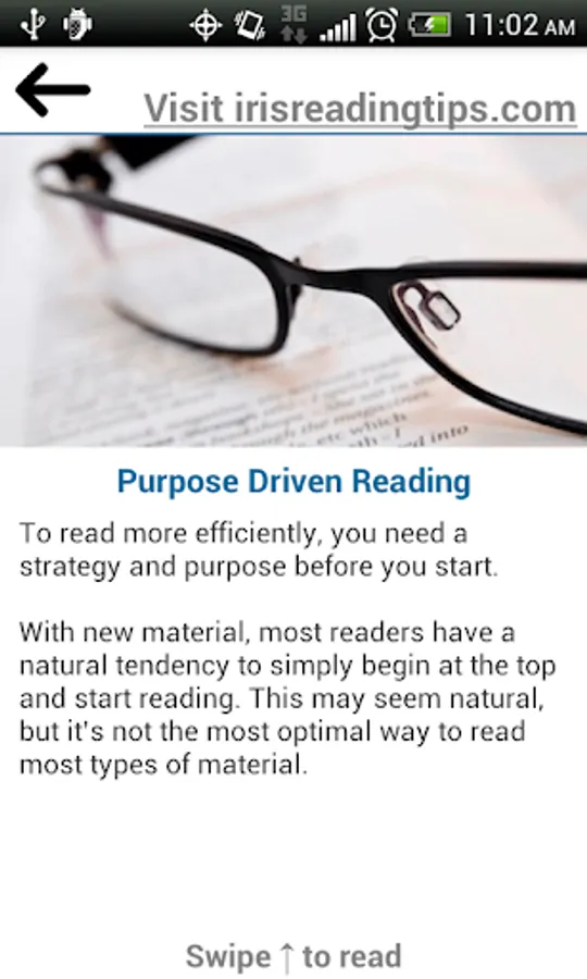 Do you have a lot of reading material but very limited time? Speed Reading Tips provides proven methods and practices that help improve your reading speed, comprehension, and retention. Whether it's reading for fun, reading for school, or reading for your job, Speed Reading Tips is the perfect app to help you become a more efficient reader.