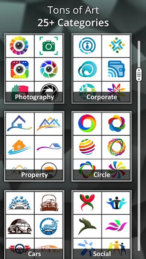Logo Maker includes a huge collection of categorized Art(Stickers), Graphic Elements, Shapes, Backgrounds & Textures to create an original logo in no time.