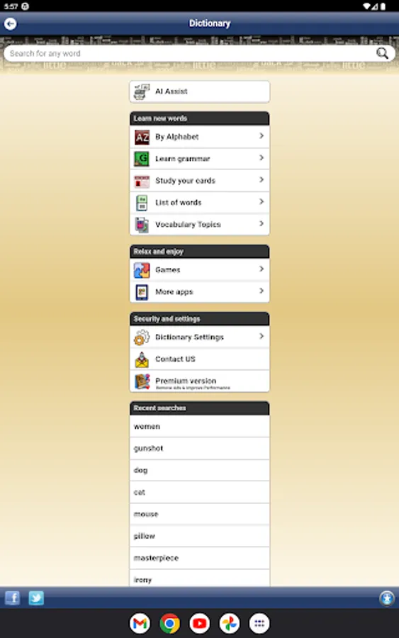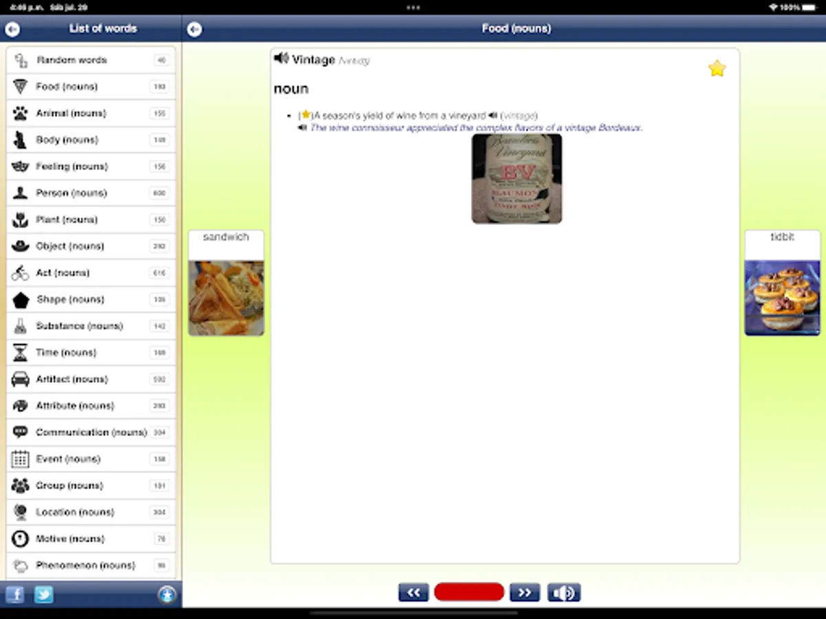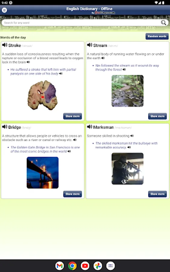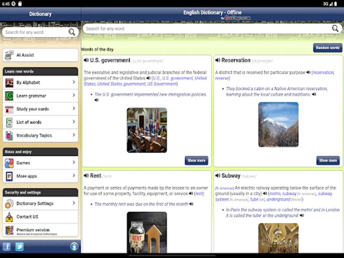 - This incredible mobile application offers you an endless array of words with their definitions and example sentences to expand your vocabulary. Imagine having access to over 172,000 words, more than 207,000 definitions and 60,000 example sentences right at your fingertips!
