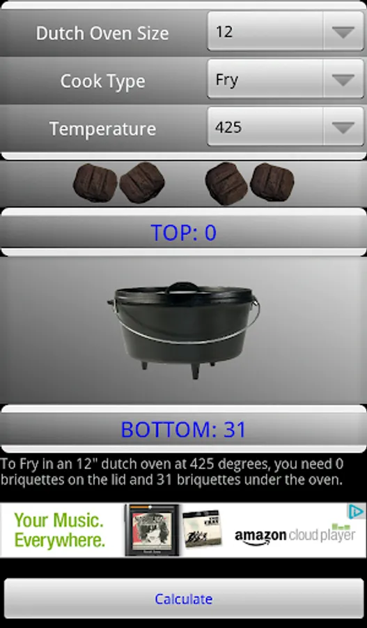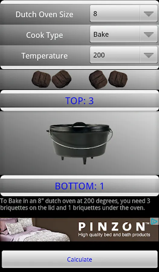 Have you ever been camping and wanted to recreate your favorite at-home dish in your Dutch oven? Do you worry about having too few or too many coals on your oven making the cooking process less-than-enjoyable? If you enjoy a hearty campfire meal cooked in a Dutch oven but don't want to have to worry with self-calculating the charcoal required for the process, then this application is for you! The Dutch Oven Calculator is an easy to use, accurate way to calculate the charcoal needed to sear, bake, and cook in your favorite Dutch oven. The charcoal calculator allows the user to input oven size, desired temperature, and cooking method to calculate the amount of hot charcoal briquettes needed on both the top and bottom of your oven. With this handy application, you can focus more on the recipe and less about the cooking.