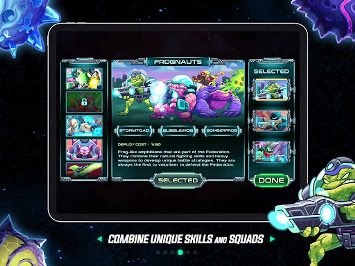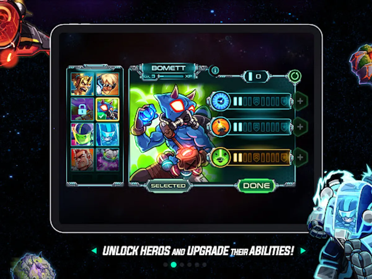Train brave heroes & their abilities: boost up your army’s firepower, increase their stamina and reach, or detect enemies before they attack. Lead them to defend peace among the galaxy!