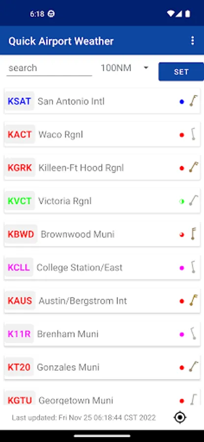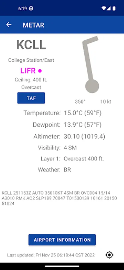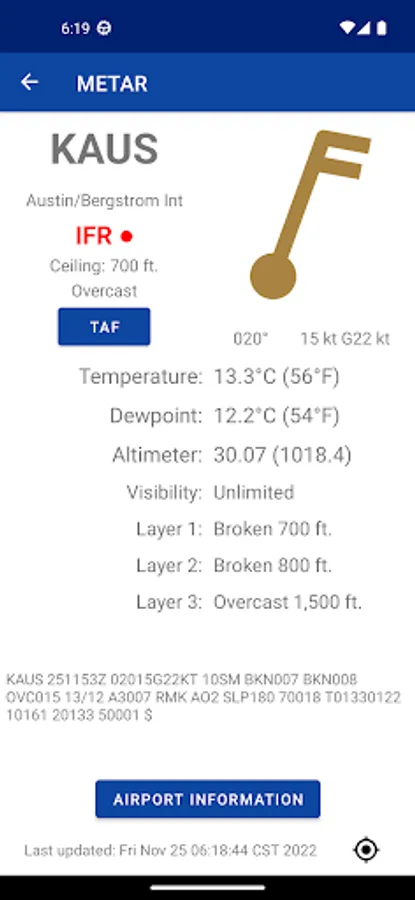 Quick, location-based access to nearby U.S. airport weather information, via the subscription-free U.S. National Weather Service Aviation Weather Center's METAR and TAF data feeds. AWC also provides METAR and TAF data for select international airports as well.