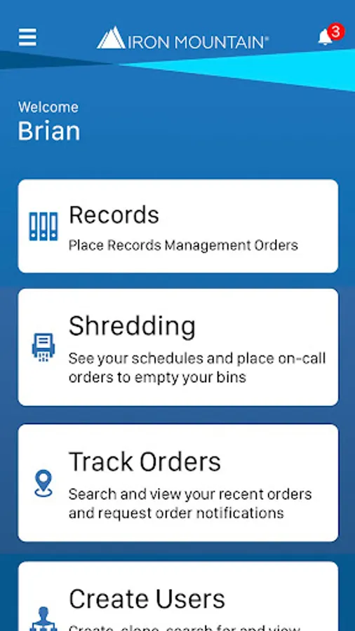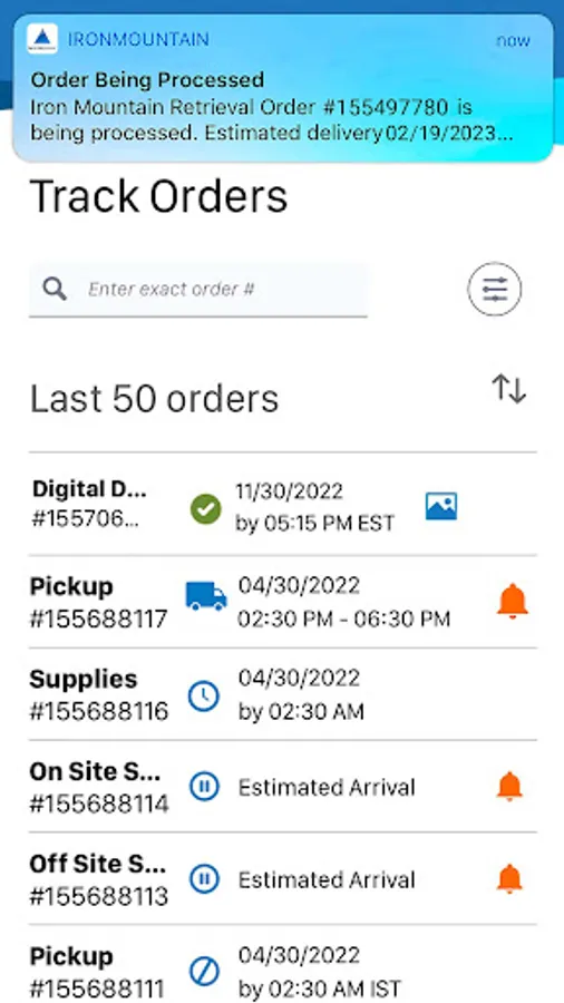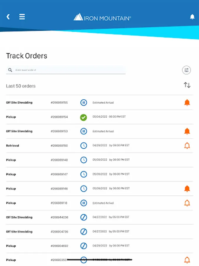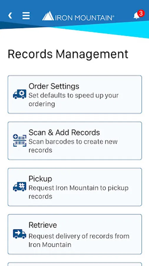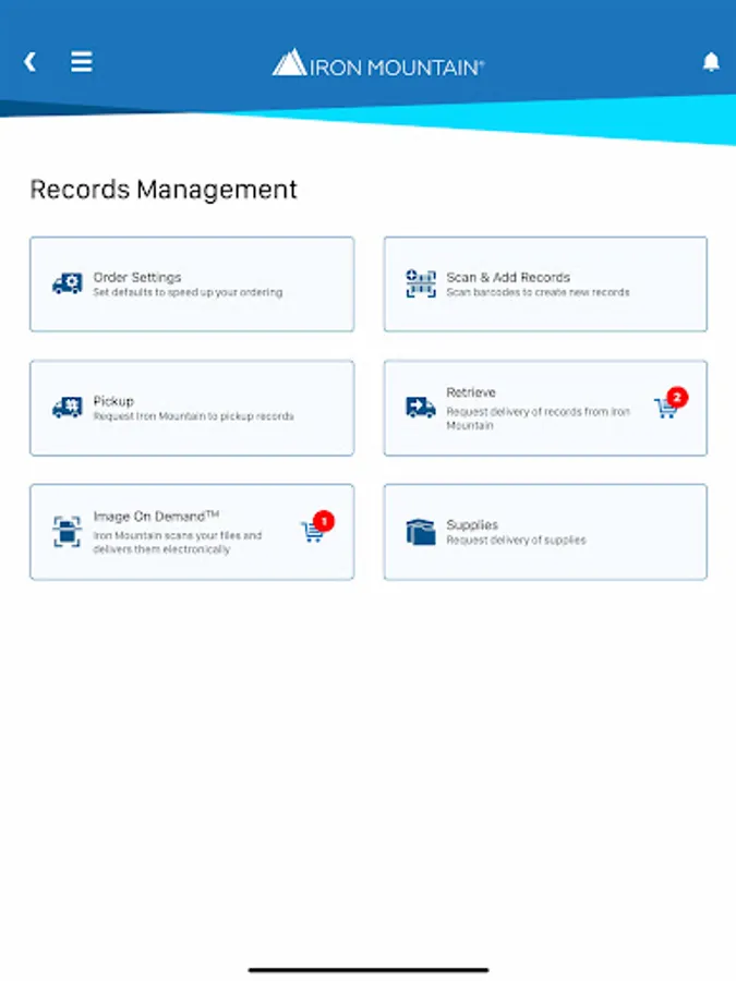 Managing records is part of your job and you need to find information fast. Iron Mountain® Mobile is your time-saving, secure way to schedule and view orders (pickups, retrievals, IODs, supplies), and track deliveries “on the go” from your mobile phone or device.