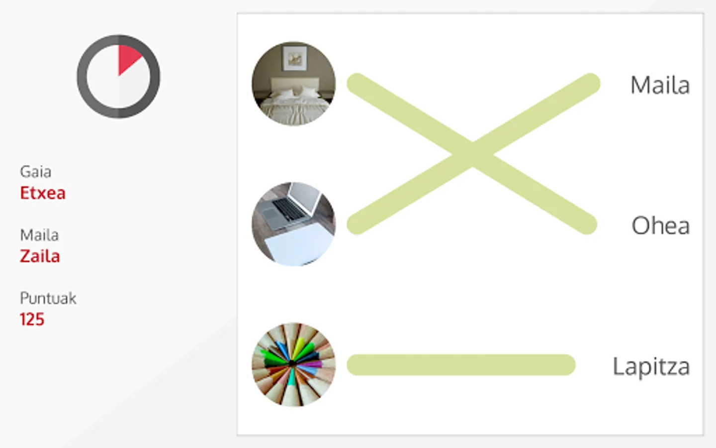 Jokoaren funtzionamendua bear erraza da: pantaila bakoitza bi ditu Catal. Ezkerreko aldean, marrazkiak erakusten dira, eta eskuinaldean, hauek identifikatzeko hitzak. Hitz bakoitza marrazkiarekin dagokion lotzea besterik gives helburua, atzamarraz lagunduta.