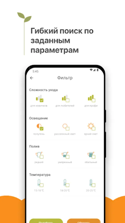 * Categorizing with selection of plants on the set parameters - level of illumination, ease of care, watering frequency, and other