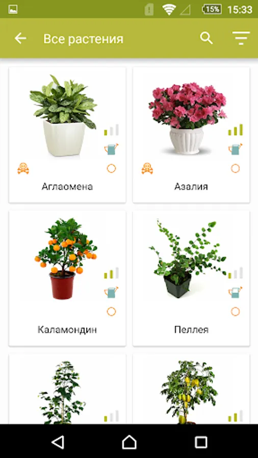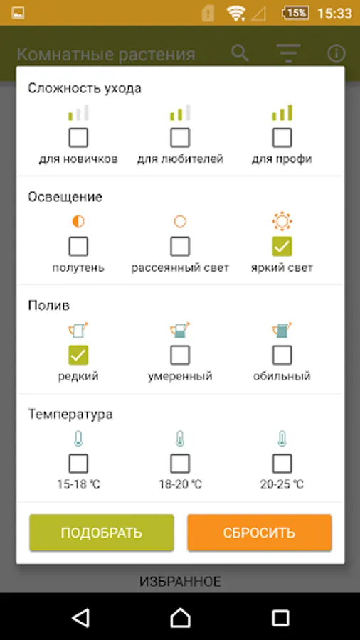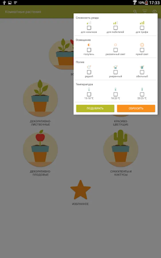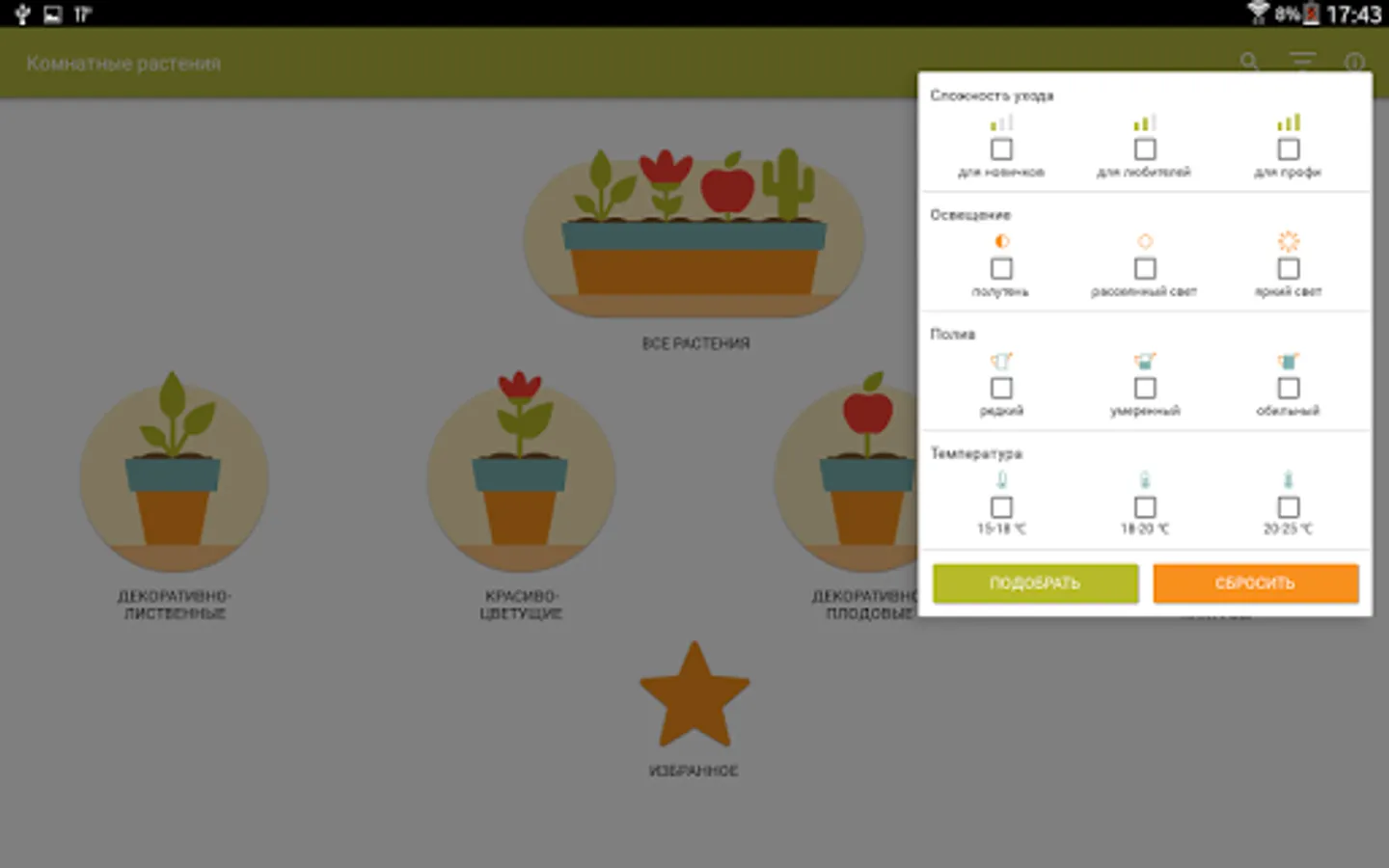 * Categorizing with selection of plants on the set parameters - level of illumination, ease of care, watering frequency, and other